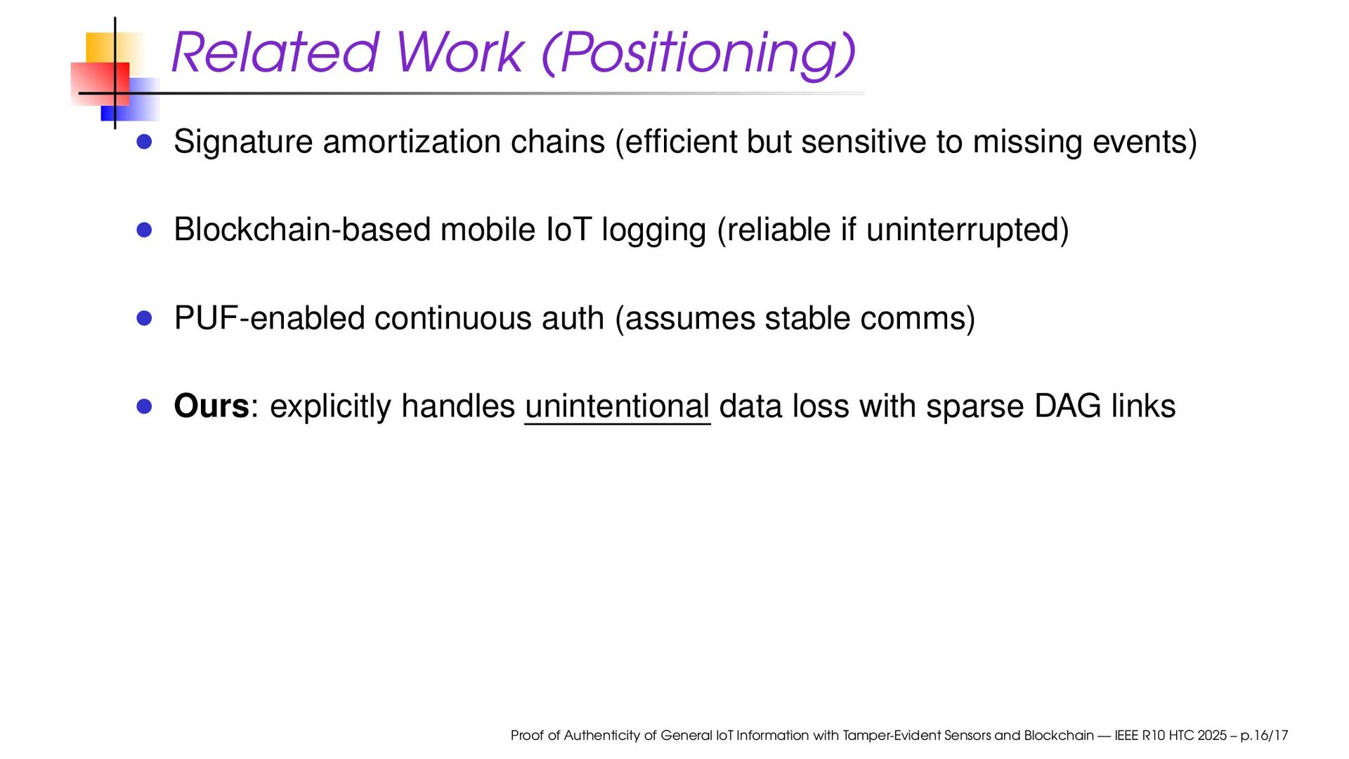 missing events) Blockchain-based mobile IoT logging (reliable if uninterrupted) PUF-enabled continuous auth (assumes stable comms) Ours: explicitly handles unintentional data loss with sparse DAG links Proof of Authenticity of General IoT Information with Tamper-Evident Sensors and Blockchain — IEEE R10 HTC 2025 – p.16/17