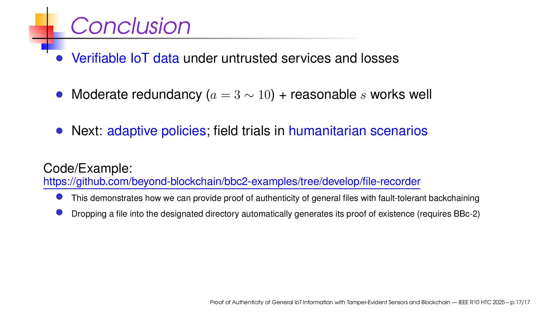redundancy (a = 3 ∼ 10) + reasonable s works well Next: adaptive policies; field trials in humanitarian scenarios Code/Example: https://github.com/beyond-blockchain/bbc2-examples/tree/develop/file-recorder This demonstrates how we can provide proof of authenticity of general files with fault-tolerant backchaining Dropping a file into the designated directory automatically generates its proof of existence (requires BBc-2) Proof of Authenticity of General IoT Information with Tamper-Evident Sensors and Blockchain — IEEE R10 HTC 2025 – p.17/17