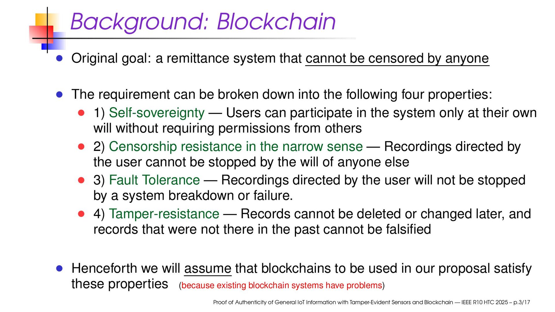 censored by anyone The requirement can be broken down into the following four properties: 1) Self-sovereignty — Users can participate in the system only at their own will without requiring permissions from others 2) Censorship resistance in the narrow sense — Recordings directed by the user cannot be stopped by the will of anyone else 3) Fault Tolerance — Recordings directed by the user will not be stopped by a system breakdown or failure. 4) Tamper-resistance — Records cannot be deleted or changed later, and records that were not there in the past cannot be falsified Henceforth we will assume that blockchains to be used in our proposal satisfy these properties (because existing blockchain systems have problems) Proof of Authenticity of General IoT Information with Tamper-Evident Sensors and Blockchain — IEEE R10 HTC 2025 – p.3/17