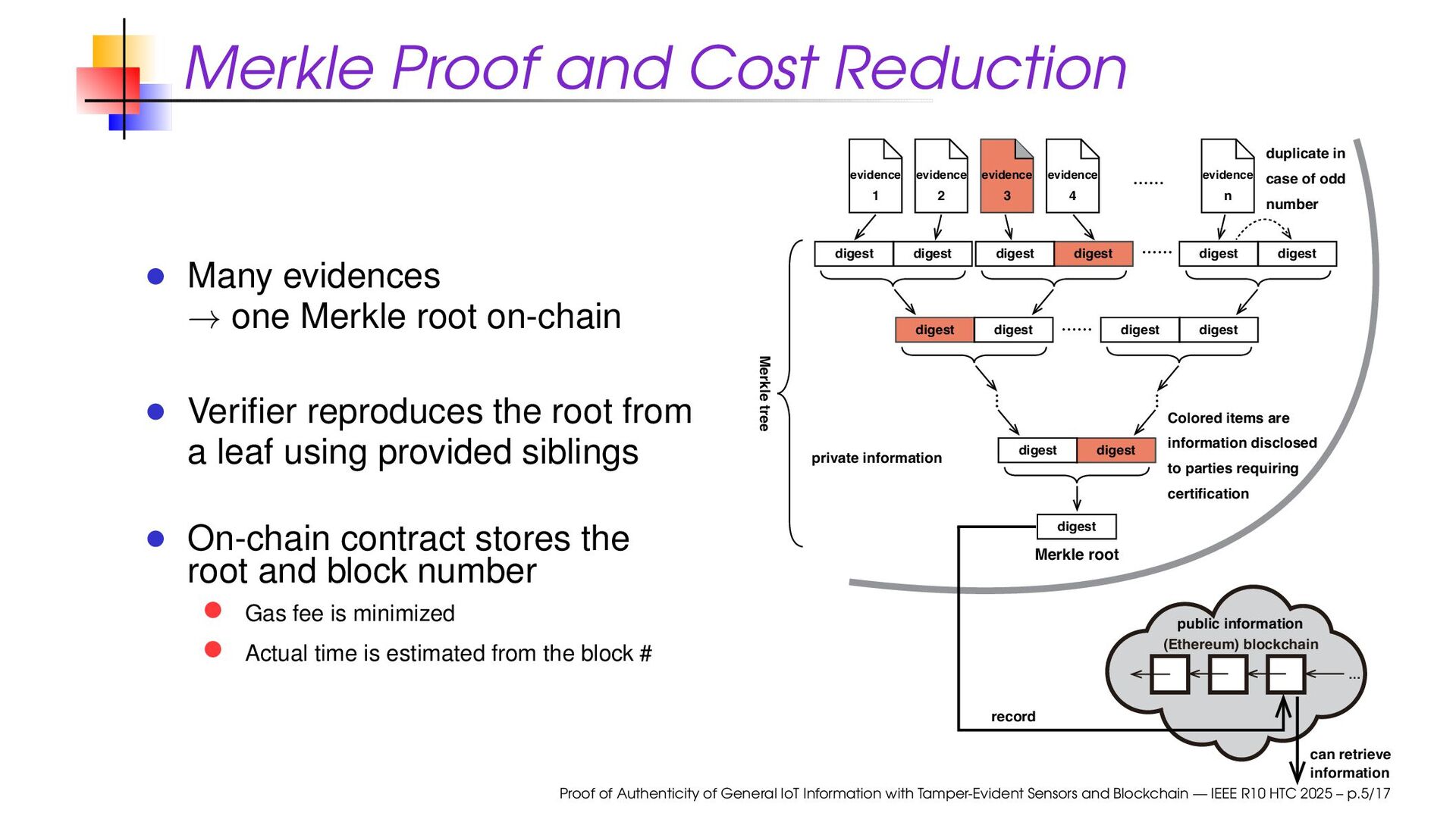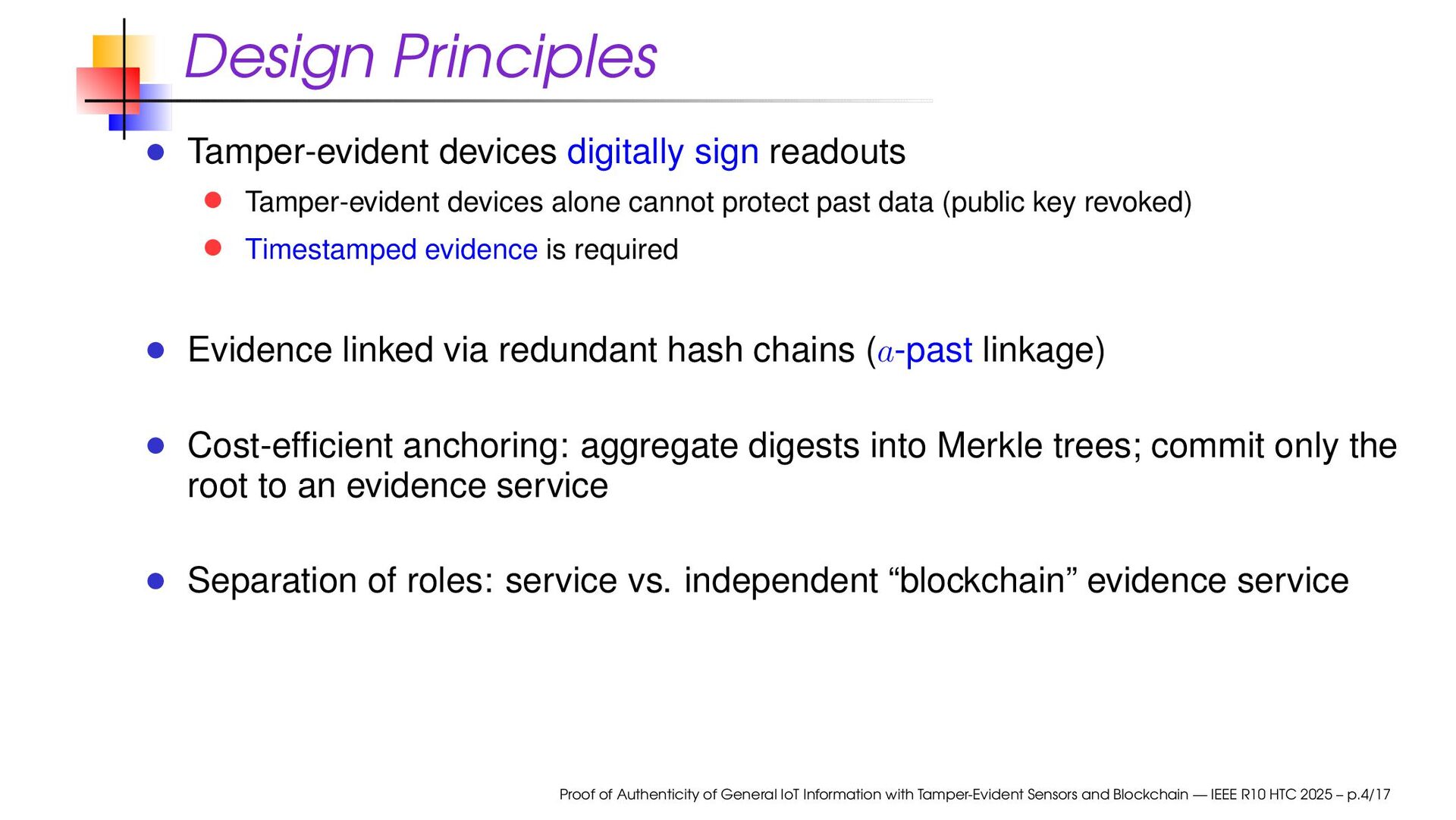 cannot protect past data (public key revoked) Timestamped evidence is required Evidence linked via redundant hash chains (a-past linkage) Cost-efficient anchoring: aggregate digests into Merkle trees; commit only the root to an evidence service Separation of roles: service vs. independent “blockchain” evidence service Proof of Authenticity of General IoT Information with Tamper-Evident Sensors and Blockchain — IEEE R10 HTC 2025 – p.4/17