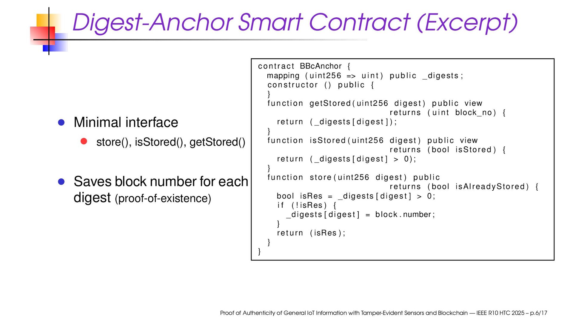 block number for each digest (proof-of-existence) contract BBcAnchor { mapping ( uint256 => u i n t ) public _digests ; constructor ( ) public { } function getStored ( uint256 digest ) public view returns ( u i n t block_no ) { return ( _digests [ digest ] ) ; } function isStored ( uint256 digest ) public view returns ( bool isStored ) { return ( _digests [ digest ] > 0 ) ; } function store ( uint256 digest ) public returns ( bool isAlreadyStored ) { bool isRes = _digests [ digest ] > 0; i f ( ! isRes ) { _digests [ digest ] = block . number ; } return ( isRes ) ; } } Proof of Authenticity of General IoT Information with Tamper-Evident Sensors and Blockchain — IEEE R10 HTC 2025 – p.6/17