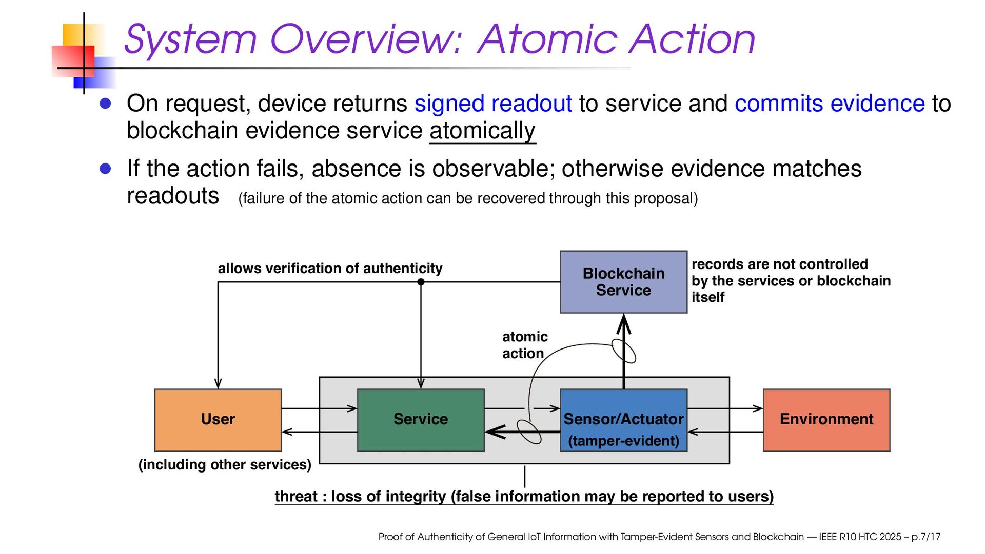 to service and commits evidence to blockchain evidence service atomically If the action fails, absence is observable; otherwise evidence matches readouts (failure of the atomic action can be recovered through this proposal) Service User Sensor/Actuator Blockchain Service Environment threat : loss of integrity (false information may be reported to users) (including other services) records are not controlled by the services or blockchain itself atomic action allows verification of authenticity (tamper-evident) Proof of Authenticity of General IoT Information with Tamper-Evident Sensors and Blockchain — IEEE R10 HTC 2025 – p.7/17