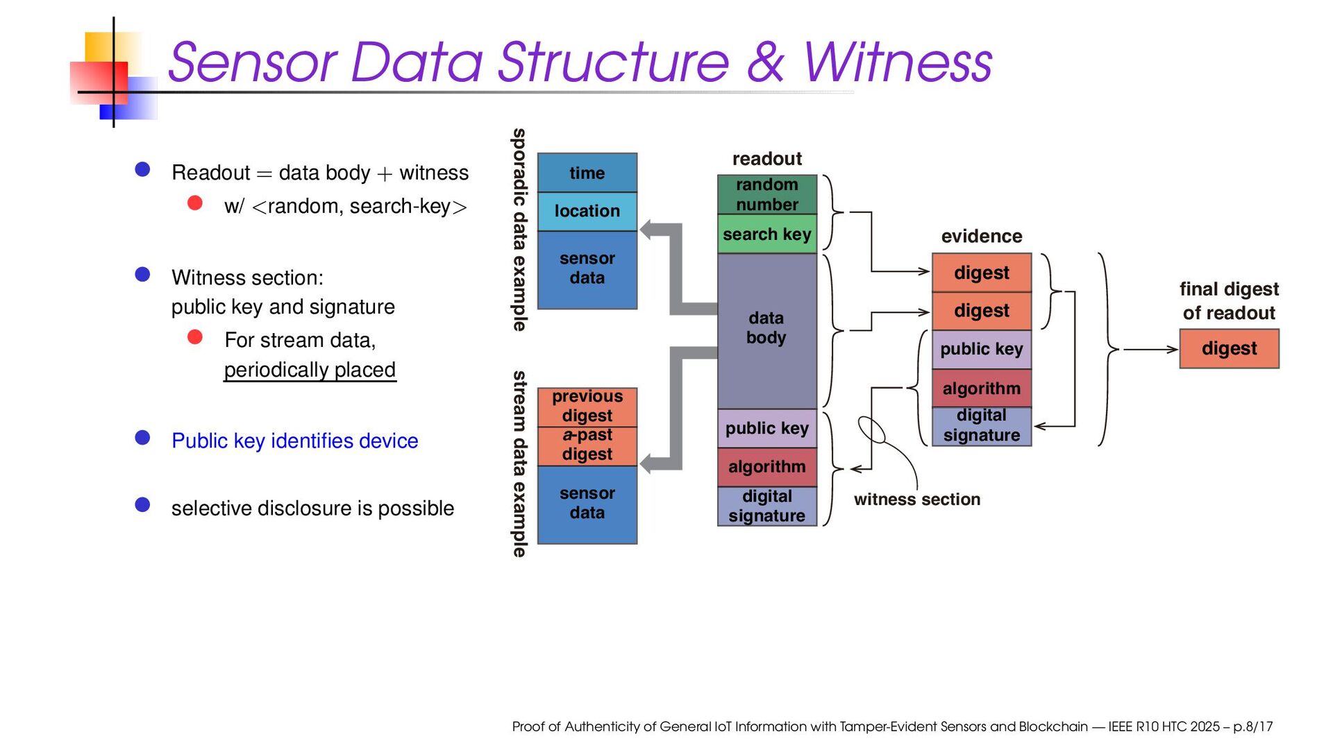 witness w/ <random, search-key> Witness section: public key and signature For stream data, periodically placed Public key identifies device selective disclosure is possible digital signature digital signature digest evidence digest digest public key algorithm public key algorithm search key readout sporadic data example final digest of readout stream data example sensor data data body a-past digest previous digest location sensor data time random number witness section Proof of Authenticity of General IoT Information with Tamper-Evident Sensors and Blockchain — IEEE R10 HTC 2025 – p.8/17
