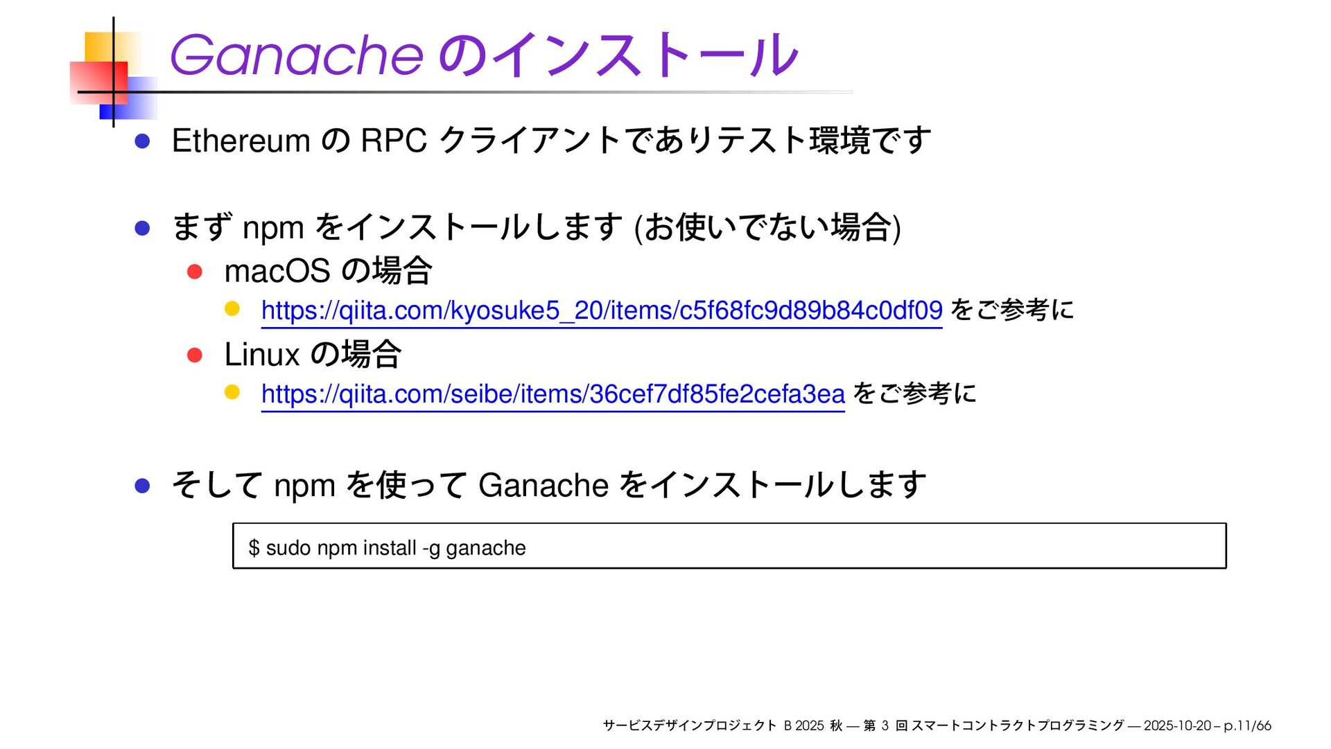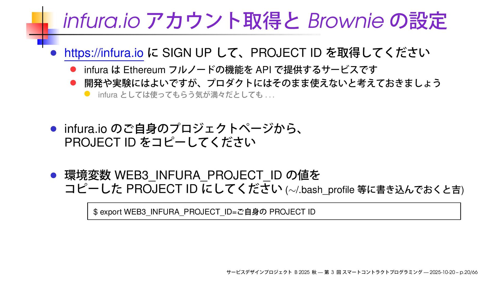 infura . . . infura.io PROJECT ID WEB3_INFURA_PROJECT_ID PROJECT ID (∼/.bash_profile ) $ export WEB3_INFURA_PROJECT_ID= PROJECT ID B 2025 — 3 — 2025-10-20 – p.20/66