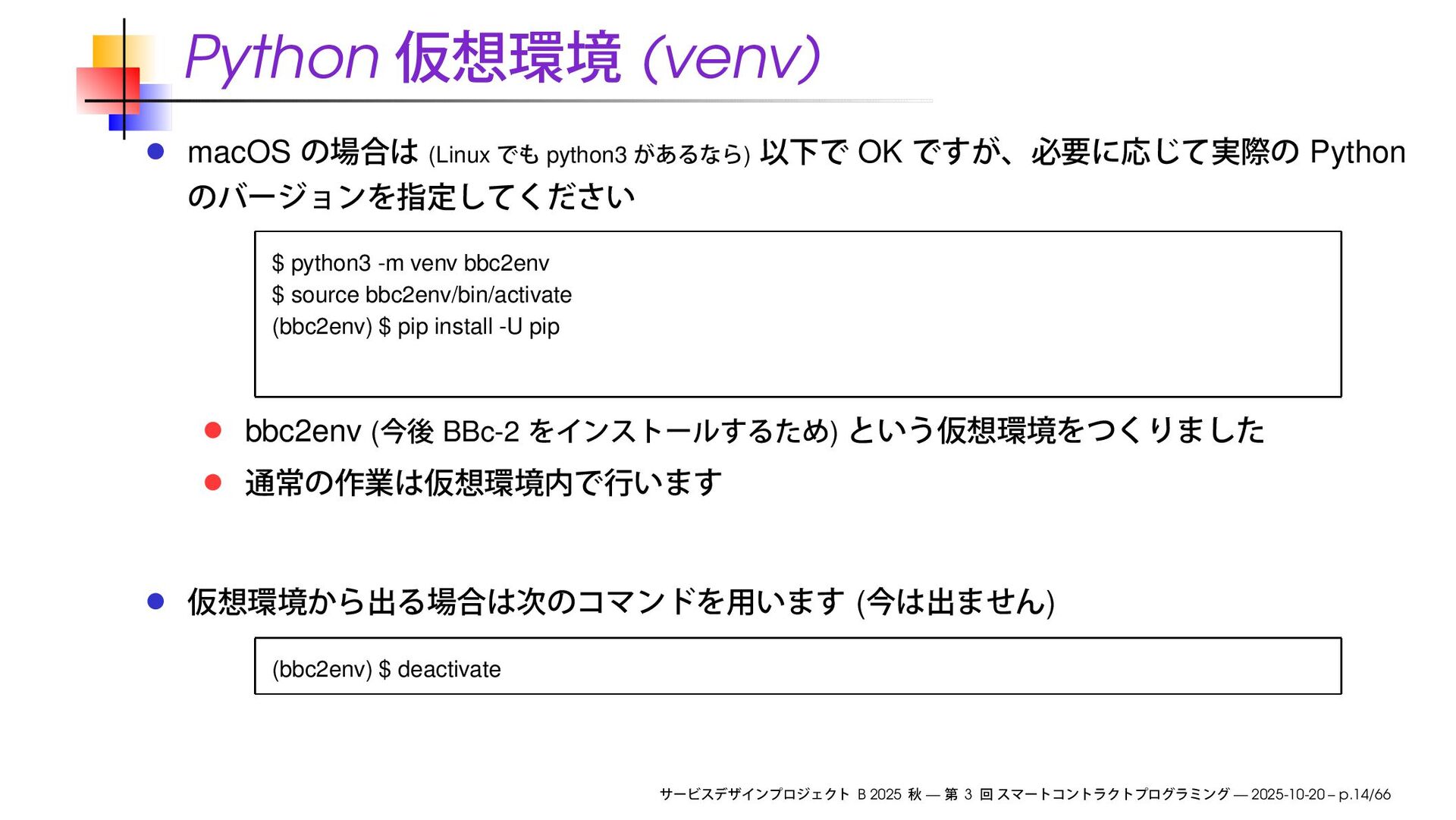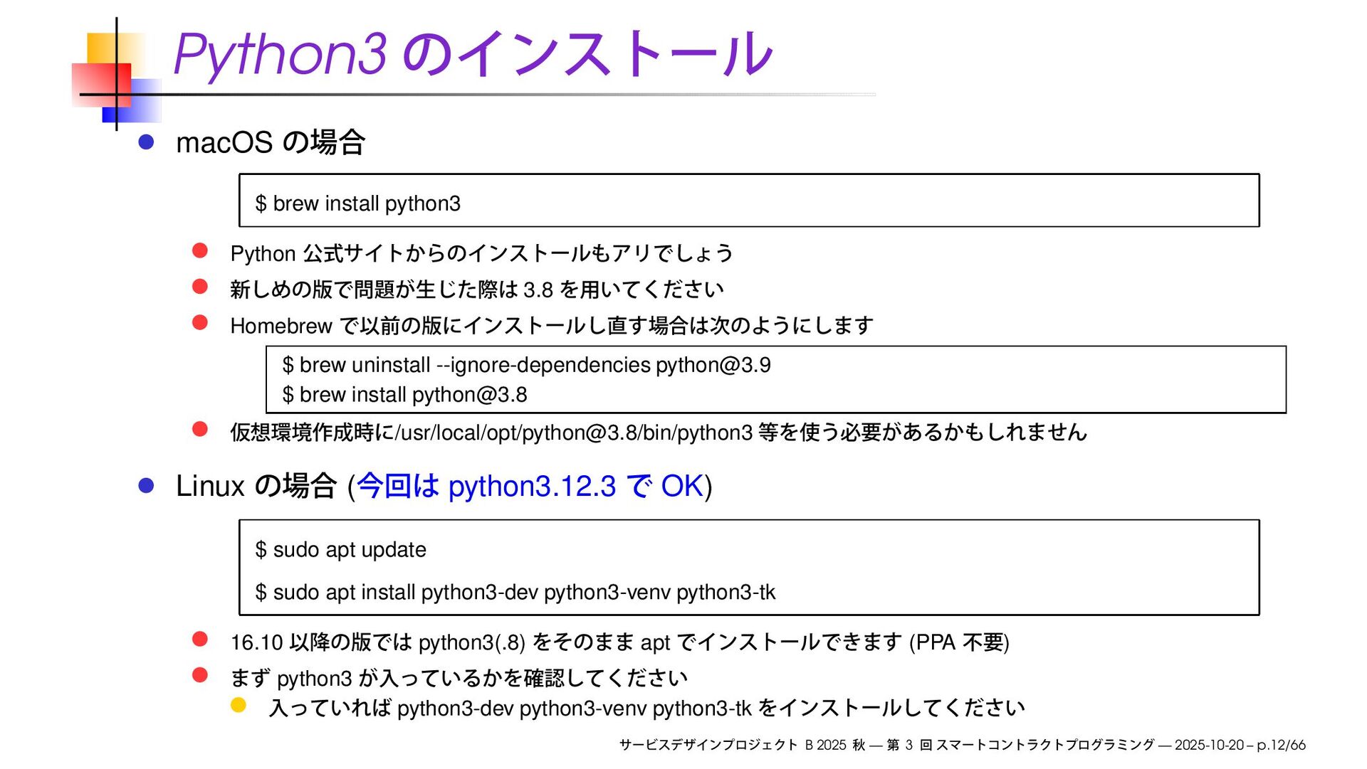 /bin/python3 Linux ( python3.12.3 OK) $ sudo apt update $ sudo apt install python3-dev python3-venv python3-tk 16.10 python3(.8) apt (PPA ) python3 python3-dev python3-venv python3-tk B 2025 — 3 — 2025-10-20 – p.12/66