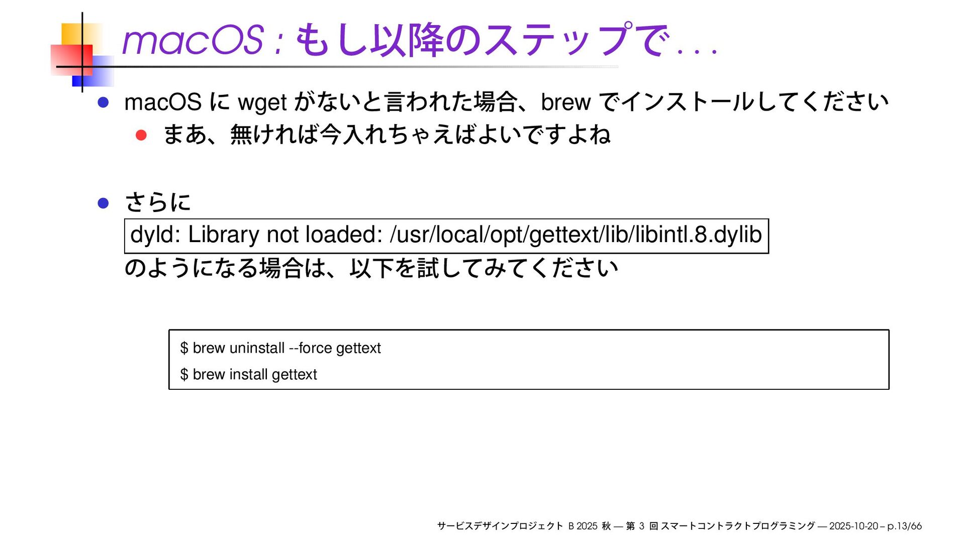 not loaded: /usr/local/opt/gettext/lib/libintl.8.dylib $ brew uninstall --force gettext $ brew install gettext B 2025 — 3 — 2025-10-20 – p.13/66