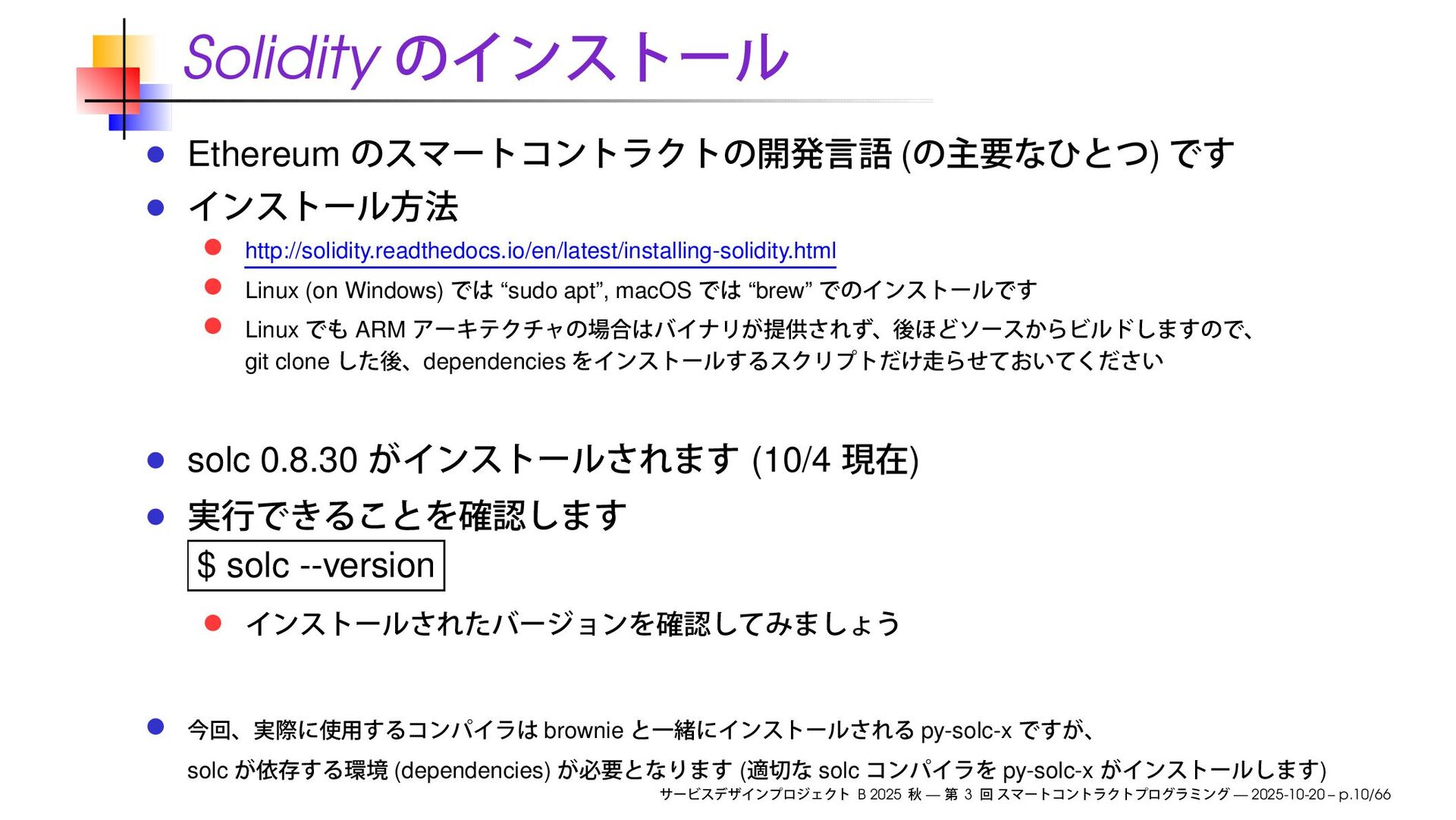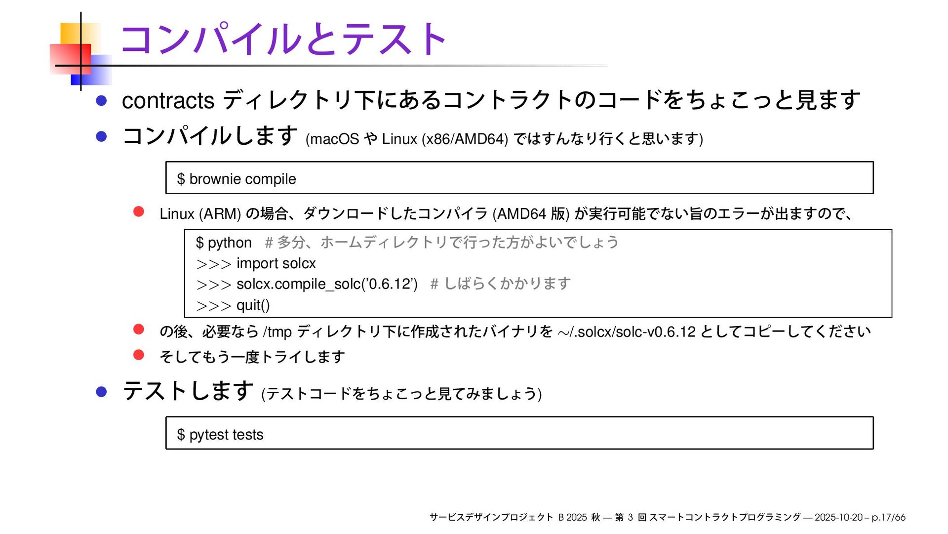 (AMD64 ) $ python # >>> import solcx >>> solcx.compile_solc(’0.6.12’) # >>> quit() /tmp ∼/.solcx/solc-v0.6.12 ( ) $ pytest tests B 2025 — 3 — 2025-10-20 – p.17/66