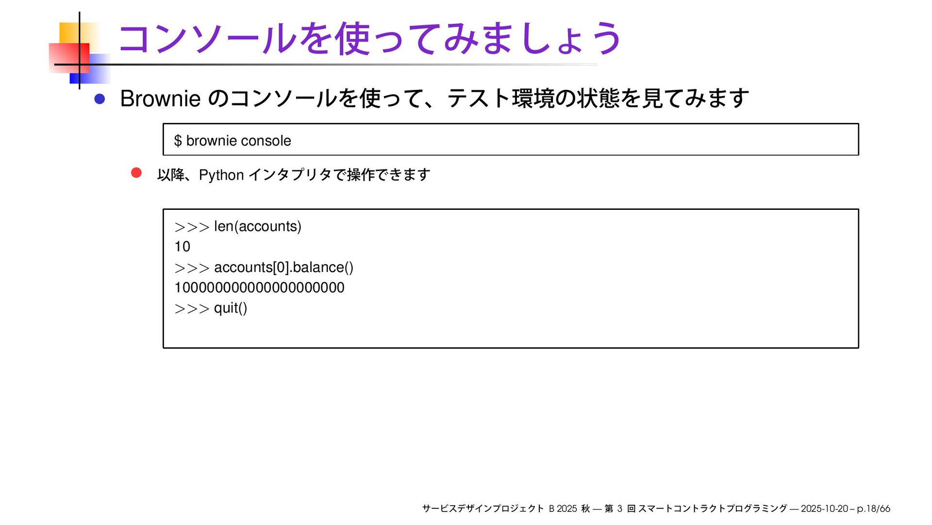 >>> len(accounts) 0 >>> accounts.add( 16 ) <LocalAccount object ’ 16 ’> >>> accounts[0].balace() ETH >>> quit() ETH >>> accounts[0].transfer(accounts[1], "0.01 ether") B 2025 — 3 — 2025-10-20 – p.22/66