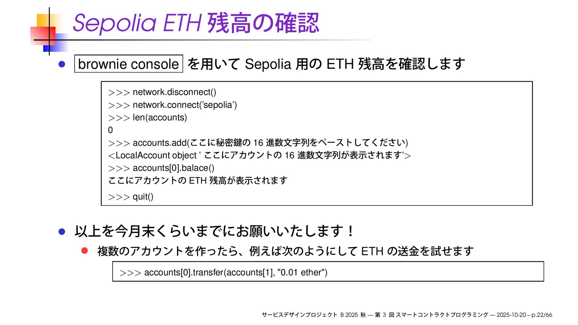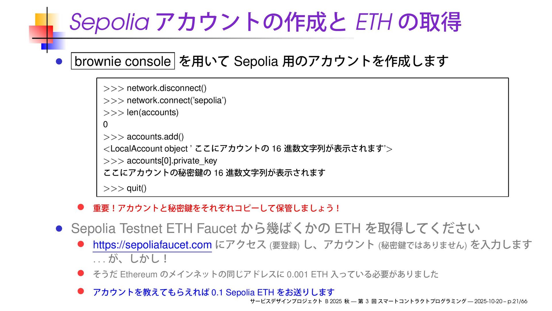 len(accounts) 0 >>> accounts.add() <LocalAccount object ’ 16 ’> >>> accounts[0].private_key 16 >>> quit() Sepolia Testnet ETH Faucet ETH https://sepoliafaucet.com ( ) ( ) . . . Ethereum 0.001 ETH 0.1 Sepolia ETH B 2025 — 3 — 2025-10-20 – p.21/66