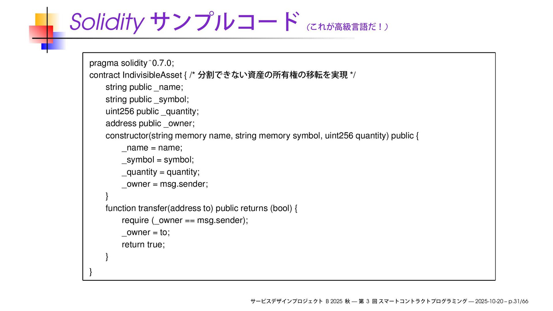 string public _name; string public _symbol; uint256 public _quantity; address public _owner; constructor(string memory name, string memory symbol, uint256 quantity) public { _name = name; _symbol = symbol; _quantity = quantity; _owner = msg.sender; } function transfer(address to) public returns (bool) { require (_owner == msg.sender); _owner = to; return true; } } B 2025 — 3 — 2025-10-20 – p.31/66