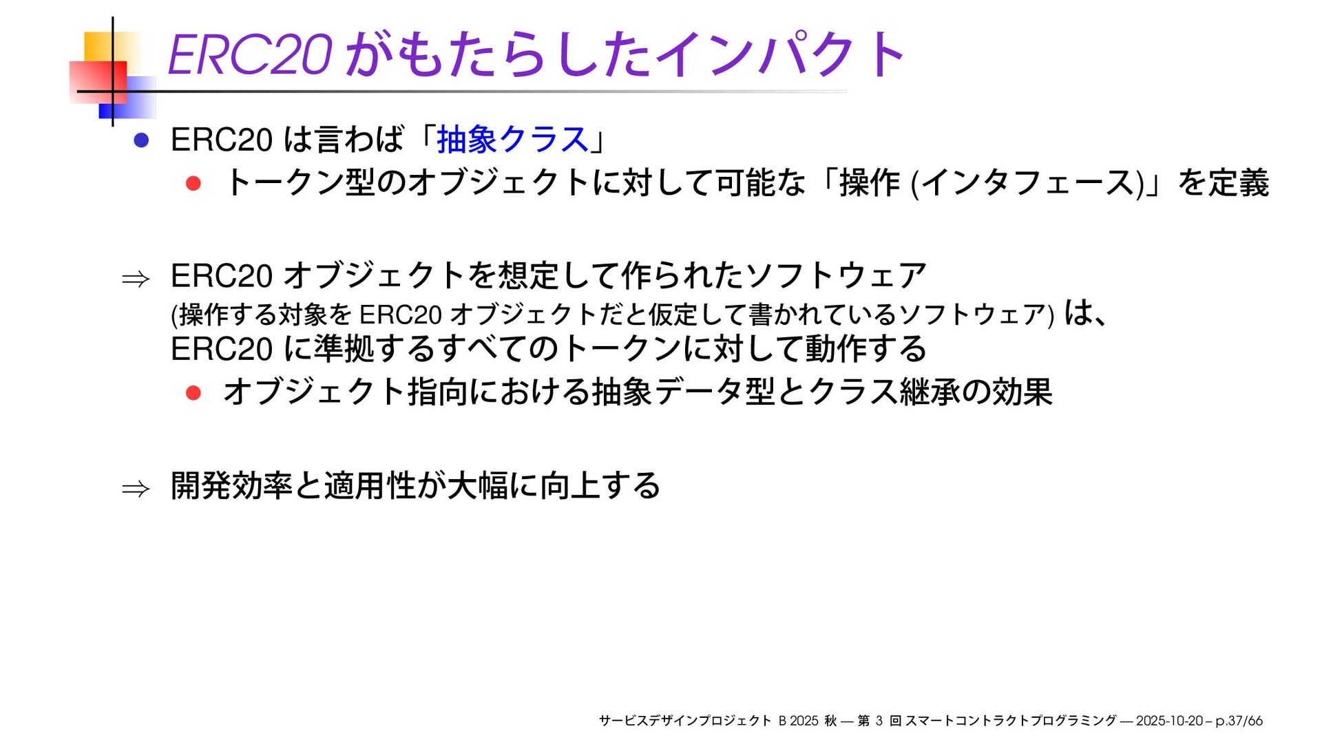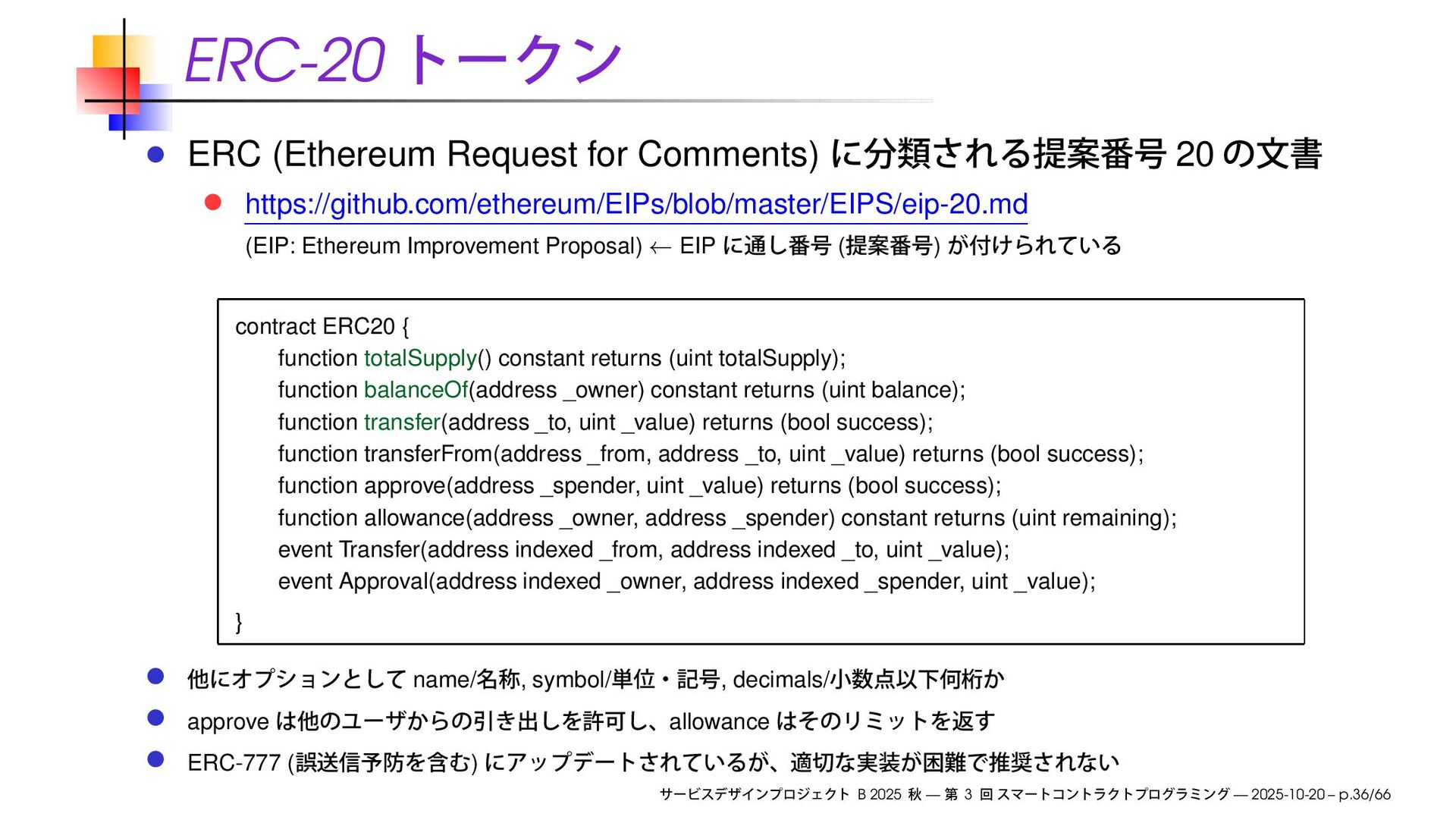 Improvement Proposal) ← EIP ( ) contract ERC20 { function totalSupply() constant returns (uint totalSupply); function balanceOf(address _owner) constant returns (uint balance); function transfer(address _to, uint _value) returns (bool success); function transferFrom(address _from, address _to, uint _value) returns (bool success); function approve(address _spender, uint _value) returns (bool success); function allowance(address _owner, address _spender) constant returns (uint remaining); event Transfer(address indexed _from, address indexed _to, uint _value); event Approval(address indexed _owner, address indexed _spender, uint _value); } name/ , symbol/ , decimals/ approve allowance ERC-777 ( ) B 2025 — 3 — 2025-10-20 – p.36/66