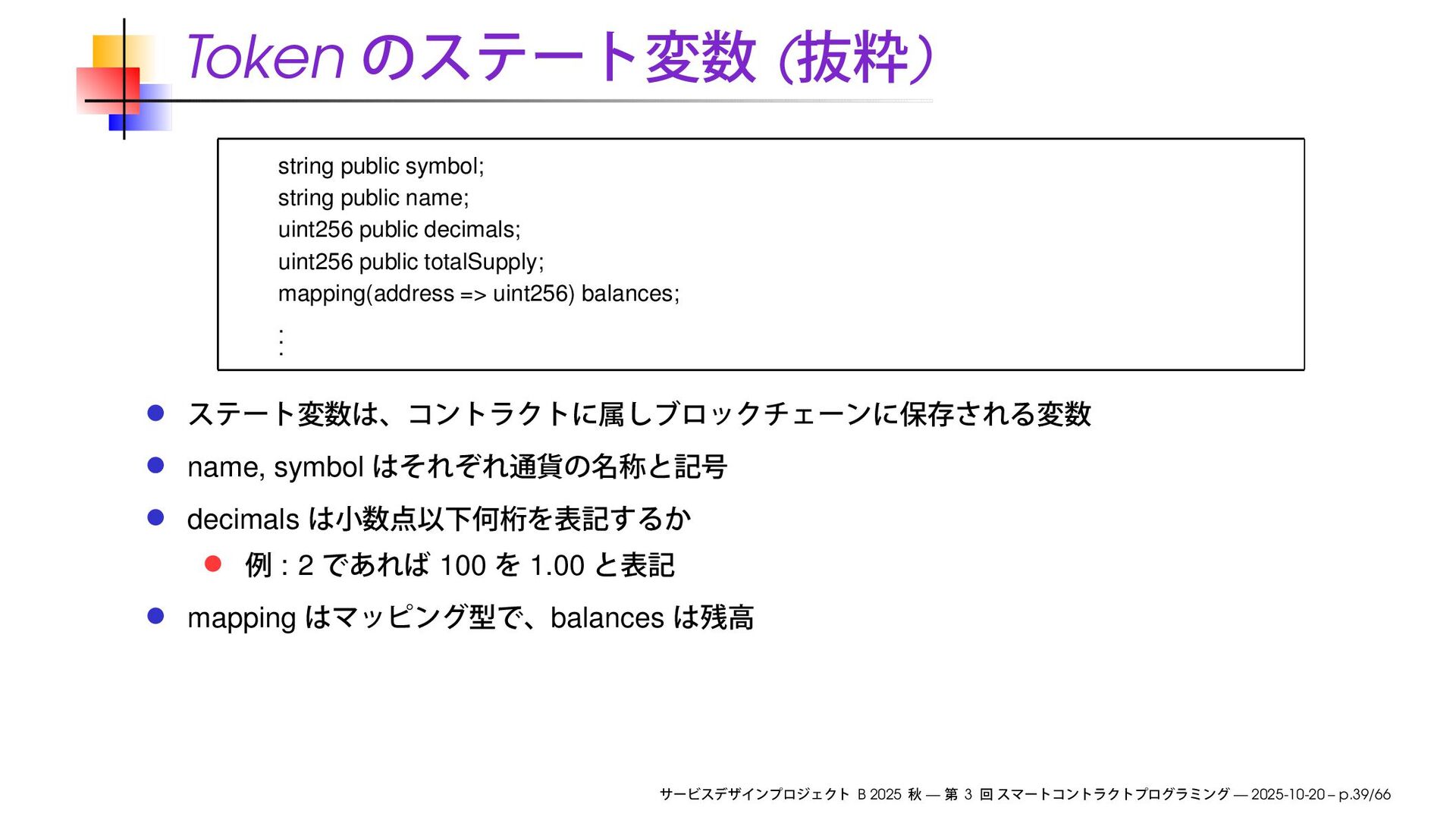 public decimals; uint256 public totalSupply; mapping(address => uint256) balances; . . . name, symbol decimals : 2 100 1.00 mapping balances B 2025 — 3 — 2025-10-20 – p.39/66