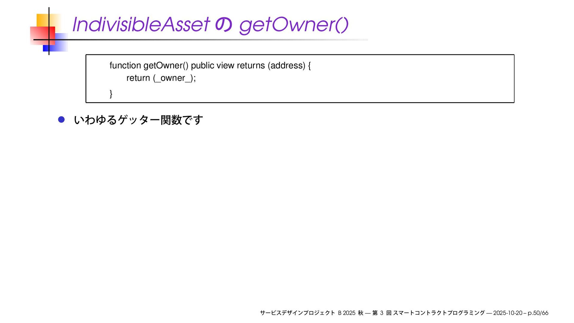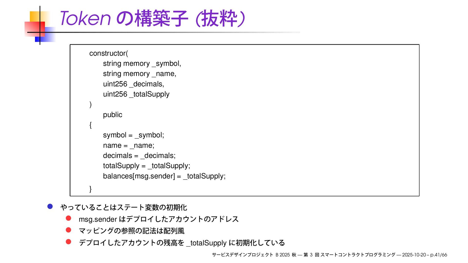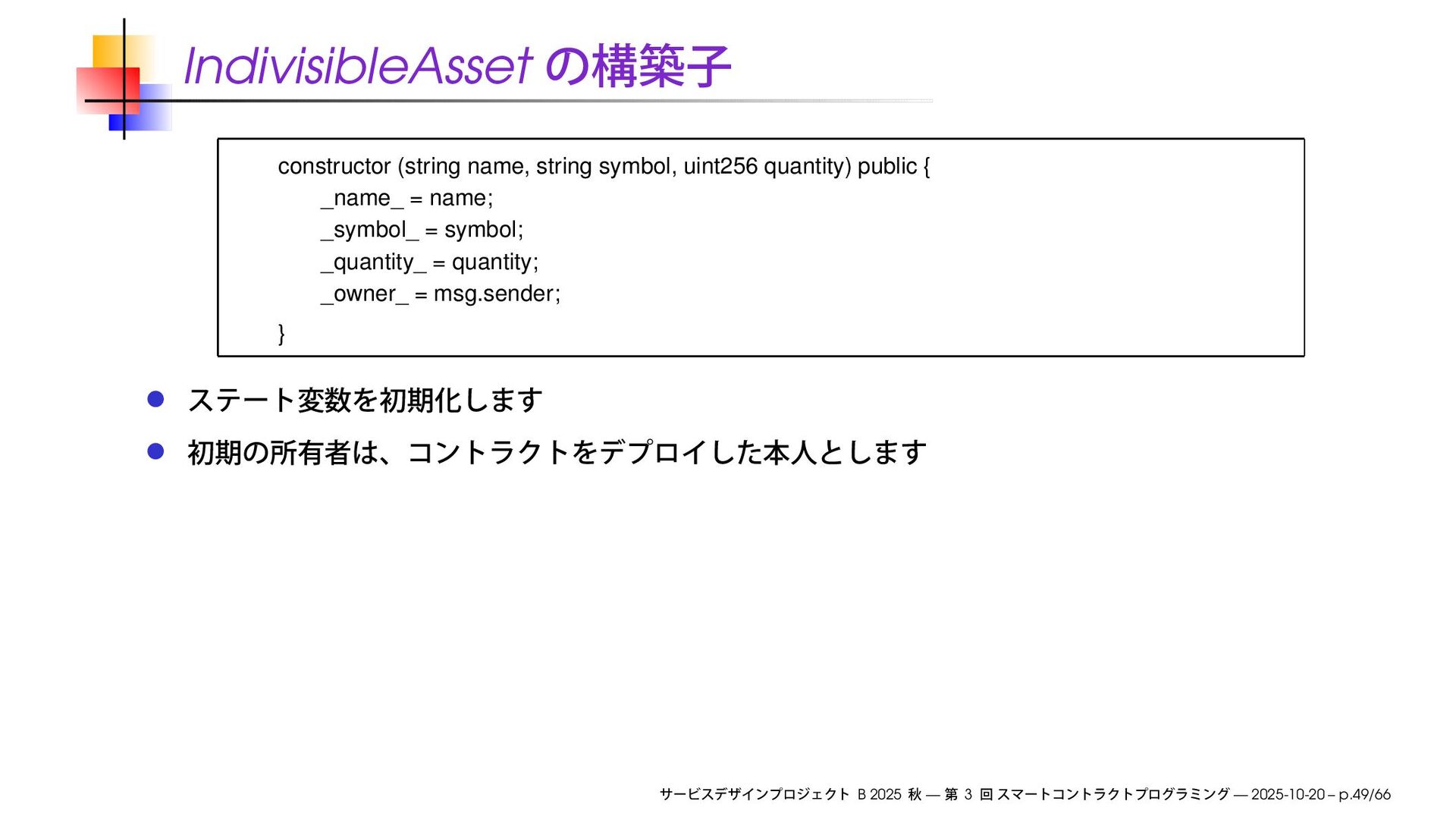 _name_ = name; _symbol_ = symbol; _quantity_ = quantity; _owner_ = msg.sender; } B 2025 — 3 — 2025-10-20 – p.49/66