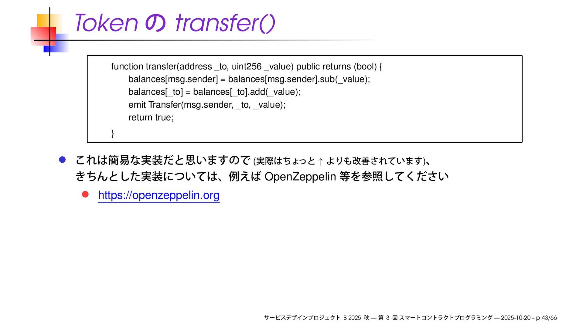 { balances[msg.sender] = balances[msg.sender].sub(_value); balances[_to] = balances[_to].add(_value); emit Transfer(msg.sender, _to, _value); return true; } ( ↑ ) OpenZeppelin https://openzeppelin.org B 2025 — 3 — 2025-10-20 – p.43/66