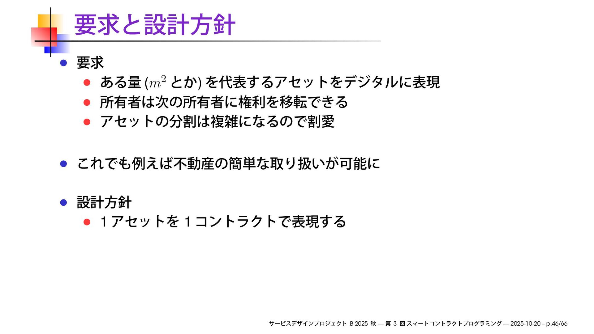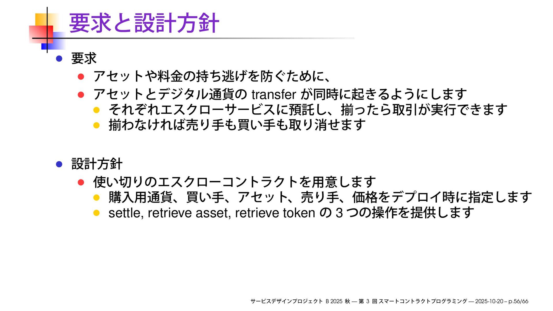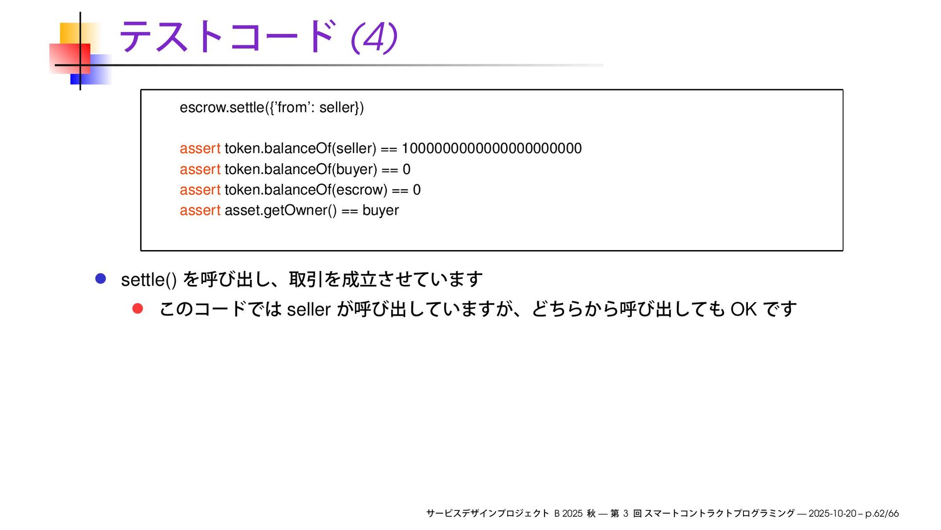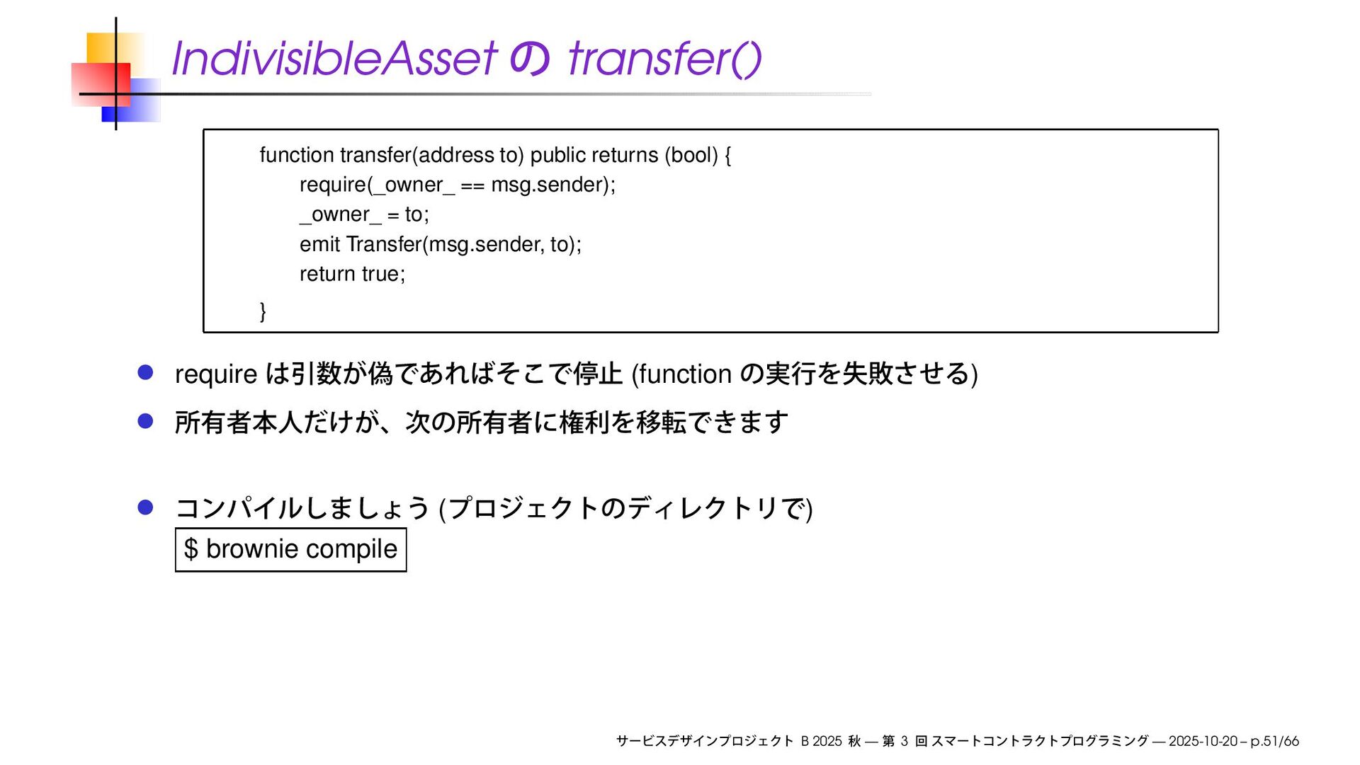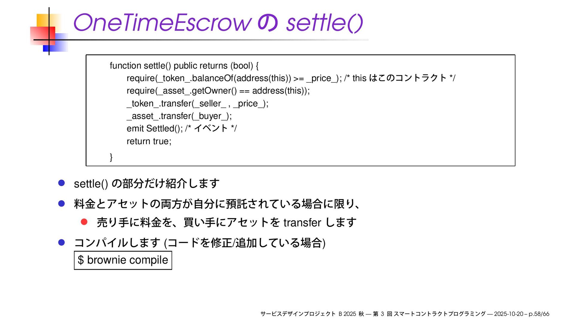 _price_); /* this */ require(_asset_.getOwner() == address(this)); _token_.transfer(_seller_ , _price_); _asset_.transfer(_buyer_); emit Settled(); /* */ return true; } settle() transfer ( / ) $ brownie compile B 2025 — 3 — 2025-10-20 – p.58/66