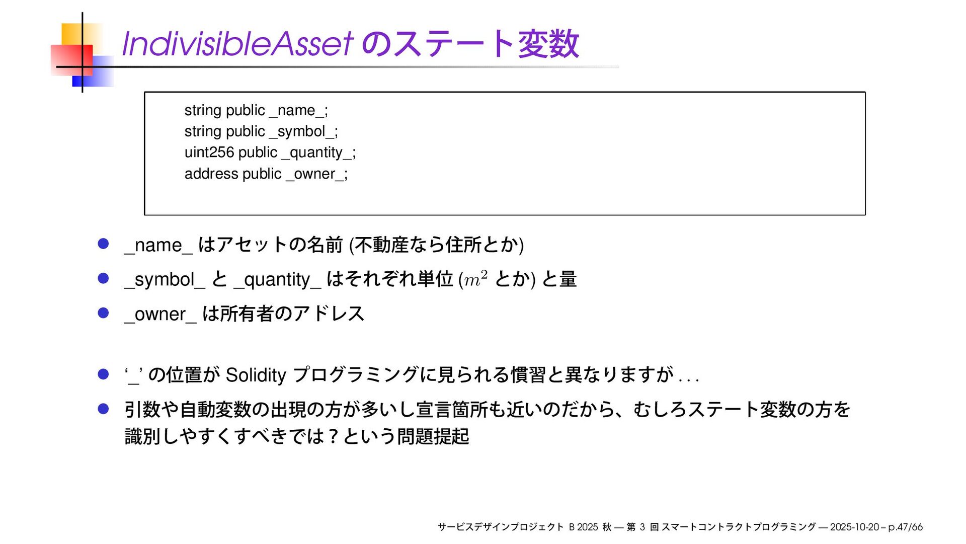 address public _owner_; _name_ ( ) _symbol_ _quantity_ (m2 ) _owner_ ‘_’ Solidity . . . B 2025 — 3 — 2025-10-20 – p.47/66