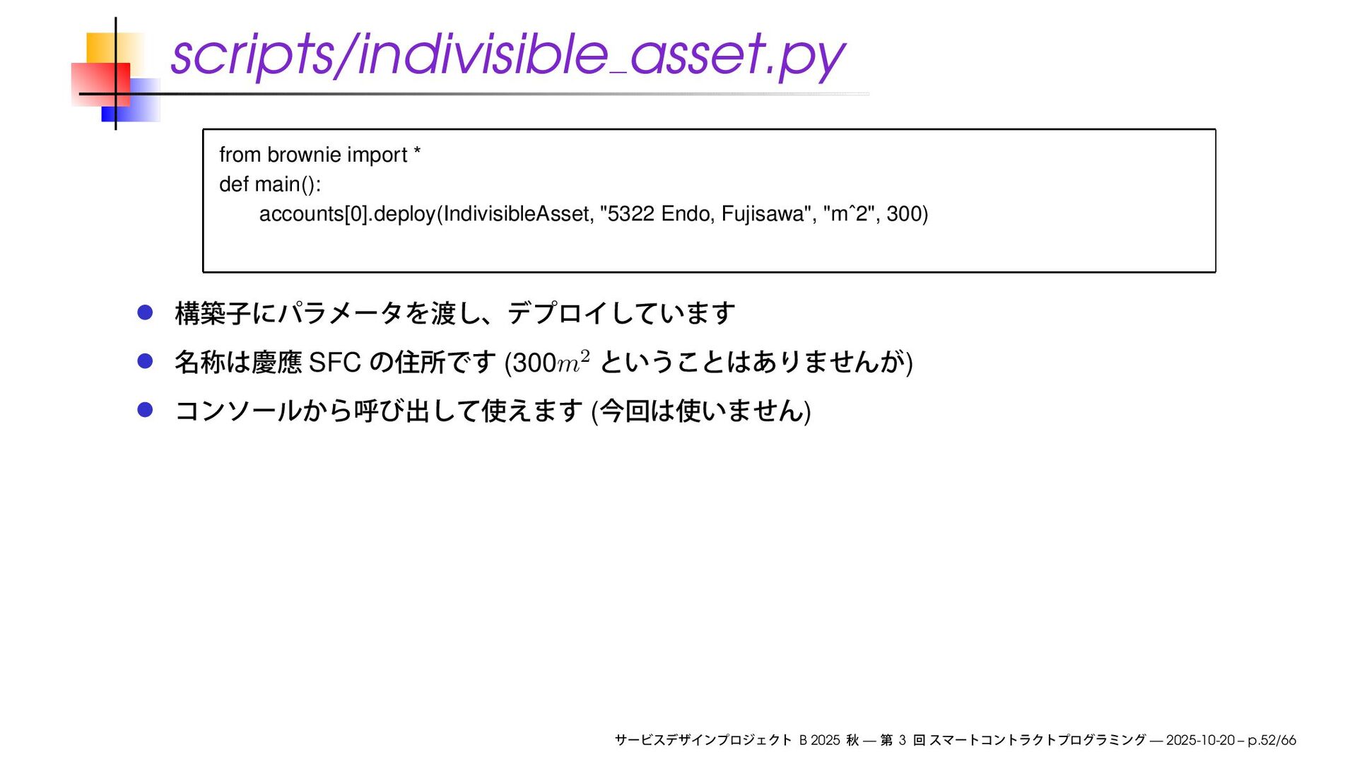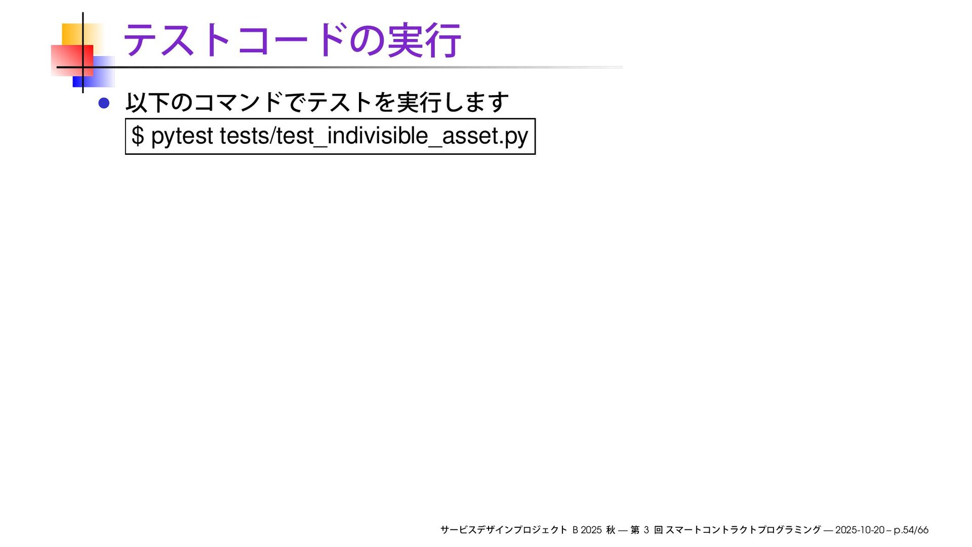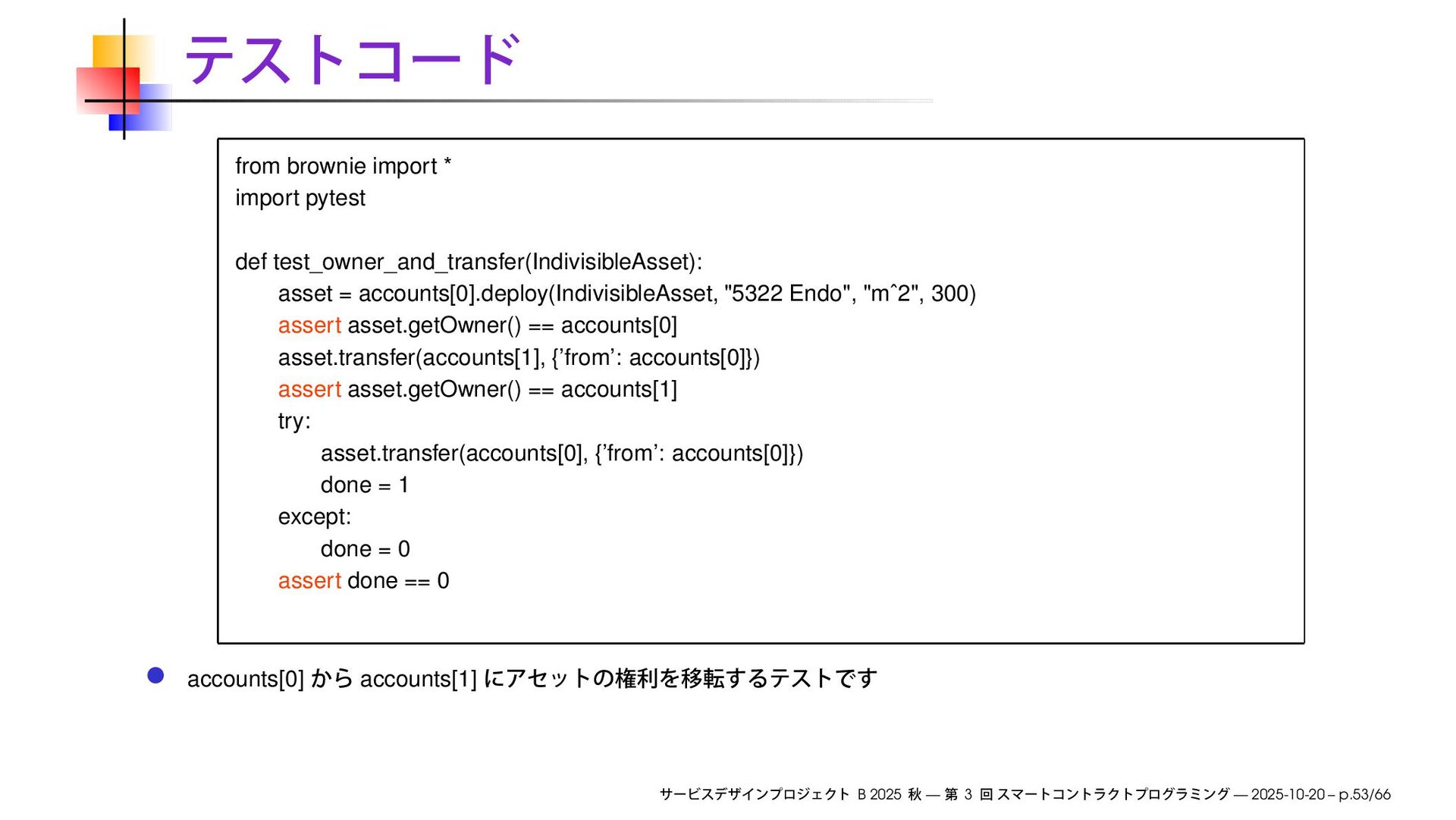 accounts[0].deploy(IndivisibleAsset, "5322 Endo", "mˆ2", 300) assert asset.getOwner() == accounts[0] asset.transfer(accounts[1], {’from’: accounts[0]}) assert asset.getOwner() == accounts[1] try: asset.transfer(accounts[0], {’from’: accounts[0]}) done = 1 except: done = 0 assert done == 0 accounts[0] accounts[1] B 2025 — 3 — 2025-10-20 – p.53/66