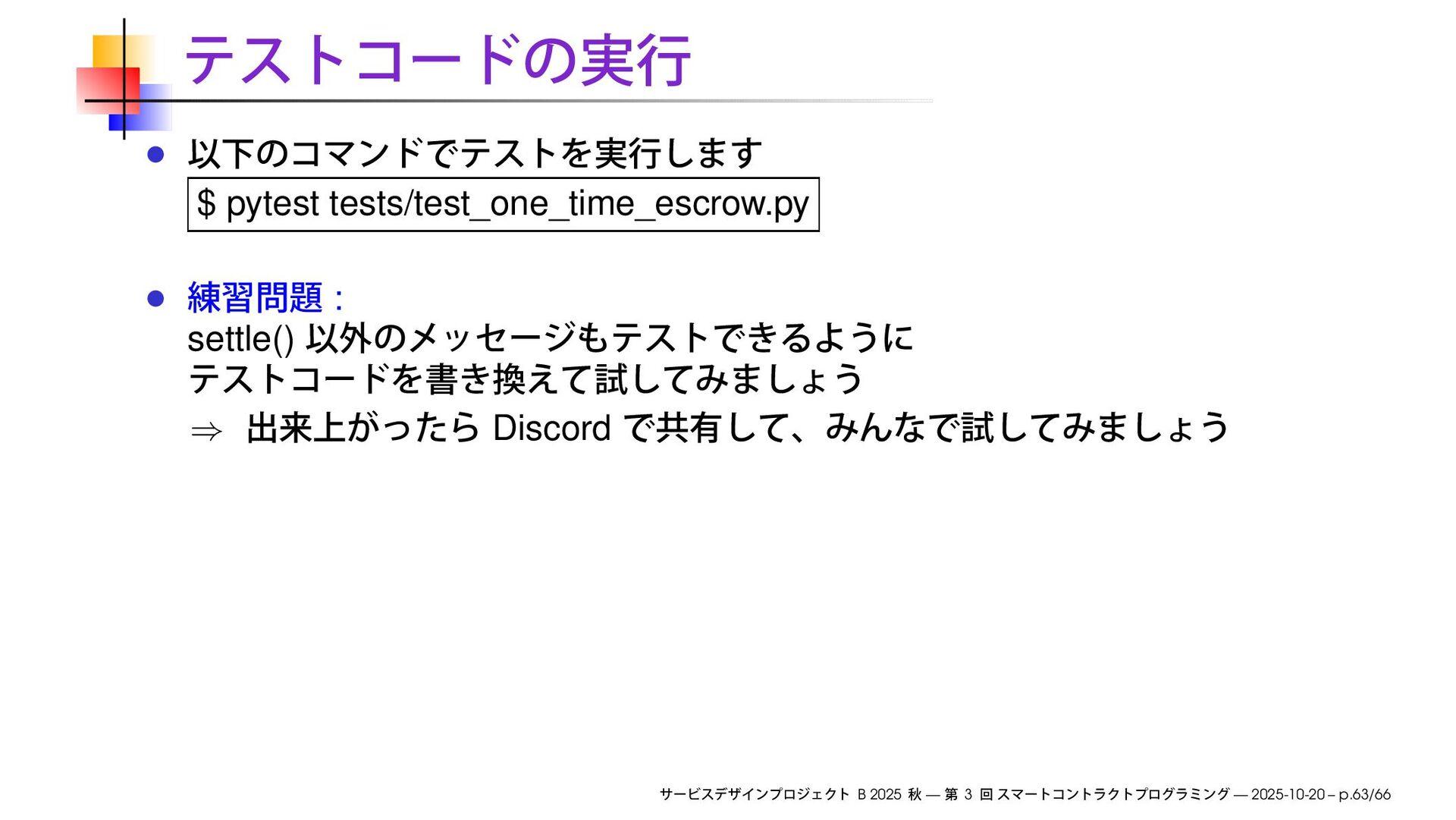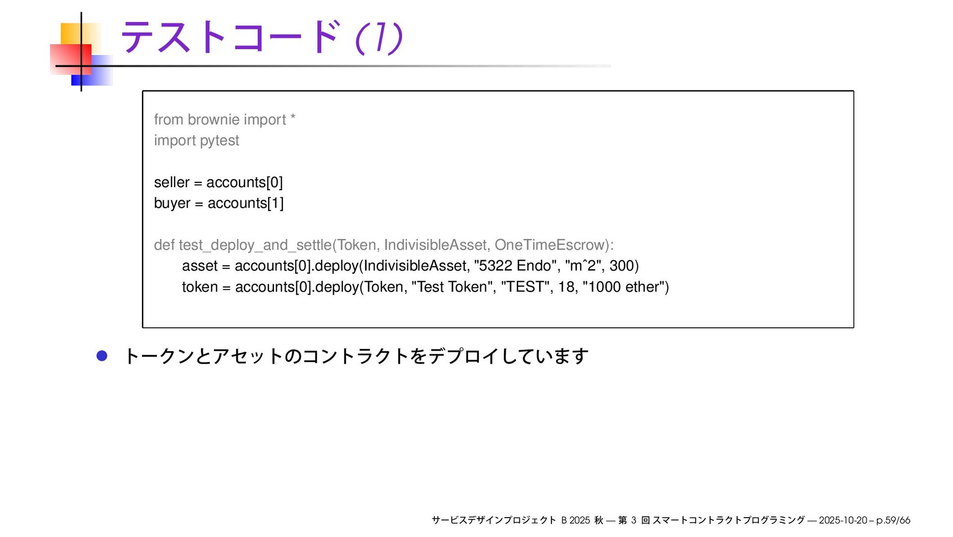 buyer = accounts[1] def test_deploy_and_settle(Token, IndivisibleAsset, OneTimeEscrow): asset = accounts[0].deploy(IndivisibleAsset, "5322 Endo", "mˆ2", 300) token = accounts[0].deploy(Token, "Test Token", "TEST", 18, "1000 ether") B 2025 — 3 — 2025-10-20 – p.59/66