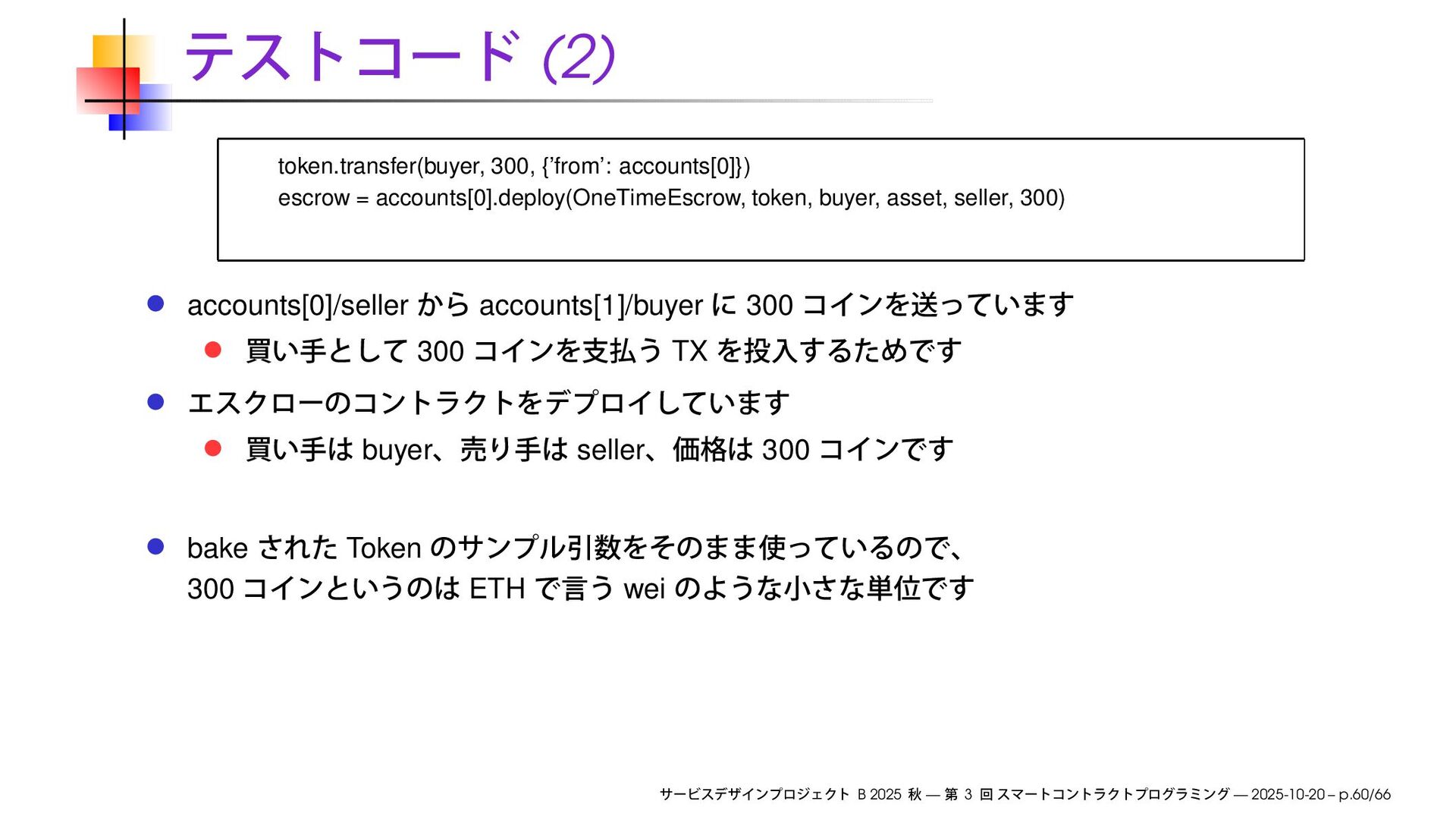 asset, seller, 300) accounts[0]/seller accounts[1]/buyer 300 300 TX buyer seller 300 bake Token 300 ETH wei B 2025 — 3 — 2025-10-20 – p.60/66