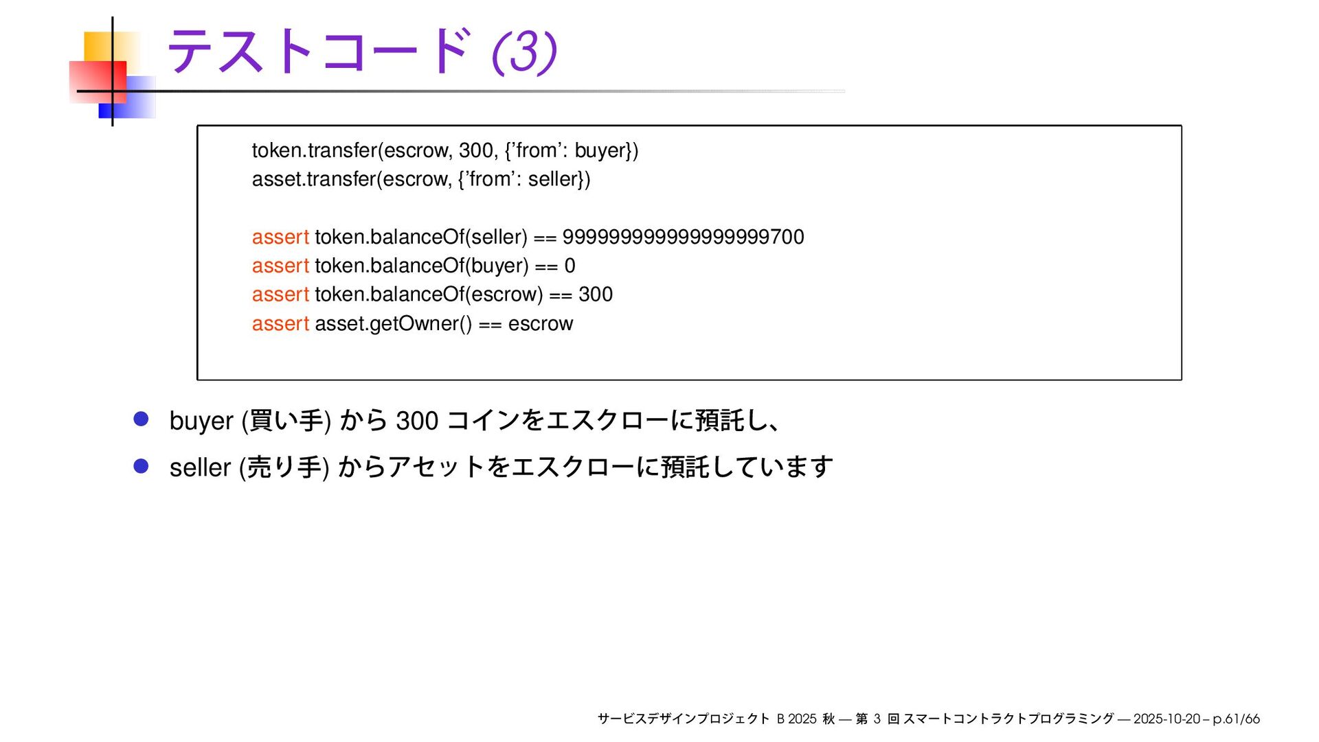 == 999999999999999999700 assert token.balanceOf(buyer) == 0 assert token.balanceOf(escrow) == 300 assert asset.getOwner() == escrow buyer ( ) 300 seller ( ) B 2025 — 3 — 2025-10-20 – p.61/66