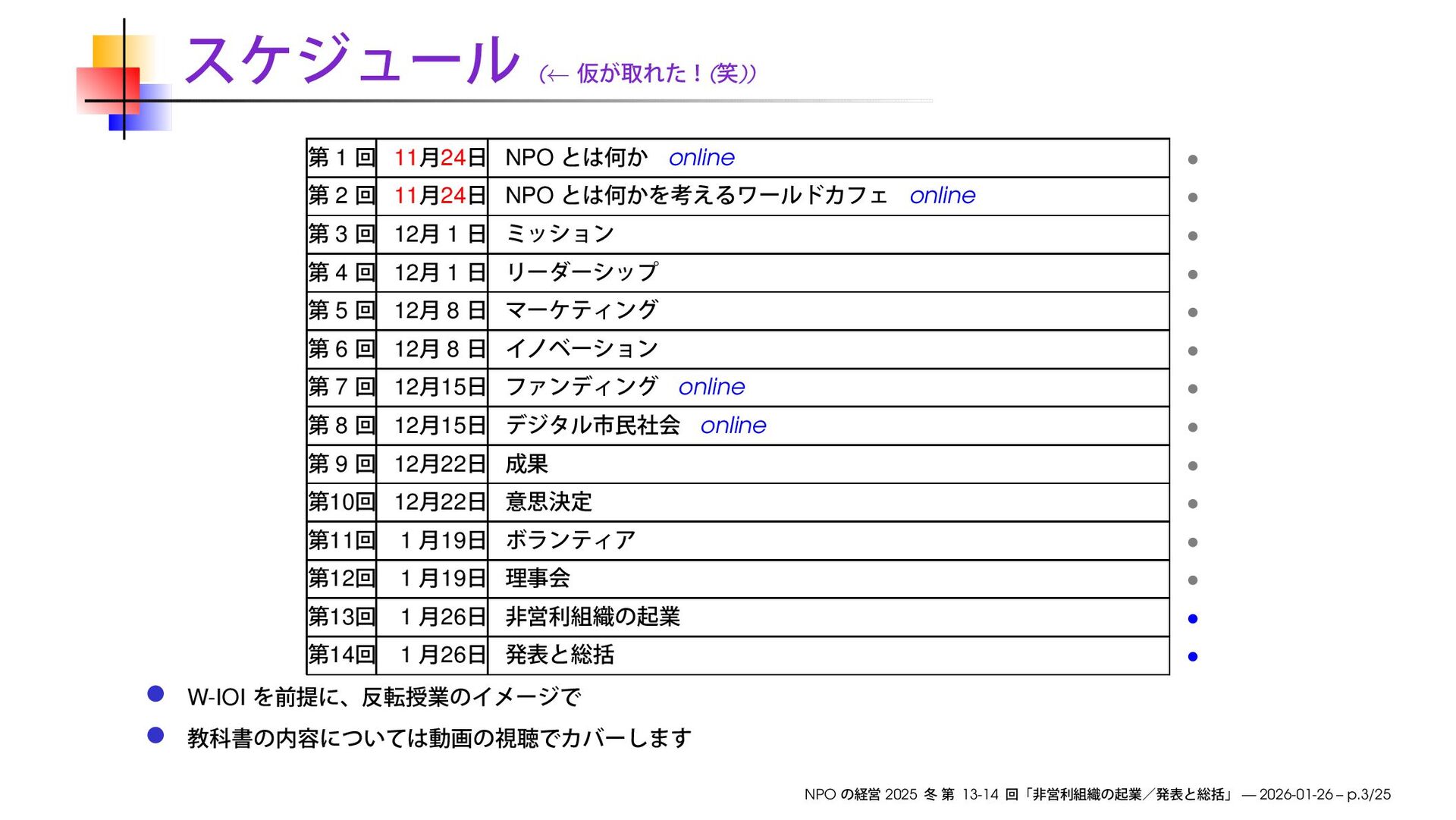 11 24 NPO online • 3 12 1 • 4 12 1 • 5 12 8 • 6 12 8 • 7 12 15 online • 8 12 15 online • 9 12 22 • 10 12 22 • 11 1 19 • 12 1 19 • 13 1 26 • 14 1 26 • W-IOI NPO 2025 13-14 — 2026-01-26 – p.3/25