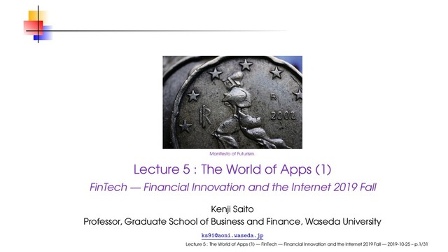 (1) FinTech — Financial Innovation and the Internet 2019 Fall Kenji Saito Professor, Graduate School of Business and Finance, Waseda University [email protected] Lecture 5 : The World of Apps (1) — FinTech — Financial Innovation and the Internet 2019 Fall — 2019-10-25 – p.1/31
