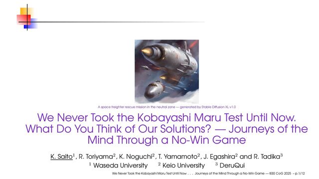 generated by Stable Diffusion XL v1.0 We Never Took the Kobayashi Maru Test Until Now. What Do You Think of Our Solutions? — Journeys of the Mind Through a No-Win Game K. Saito1, R. Toriyama2, K. Noguchi2, T. Yamamoto2, J. Egashira2 and R. Tadika3 1 Waseda University 2 Keio University 3 DeruQui We Never Took the Kobayashi Maru Test Until Now . . . Journeys of the Mind Through a No-Win Game — IEEE CoG 2025 – p.1/12