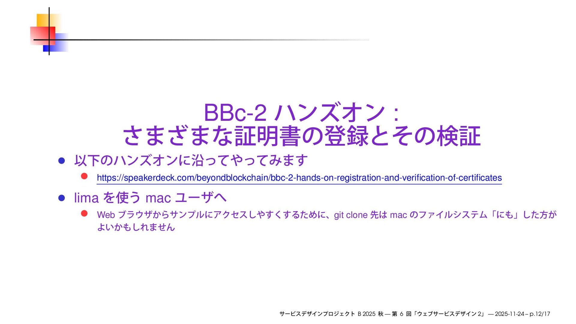 BBc-2 : https://speakerdeck.com/beyondblockchain/bbc-2-hands-on-registration-and-verification-of-certificates lima mac Web git clone mac B