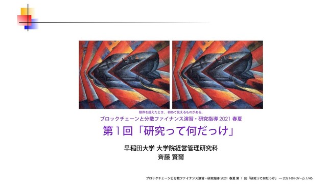 2021年4月9日、早稲田大学 大学院経営管理研究科の「ブロックチェーンと分散ファイナンス演習・研究指導 (2021春夏)」第1回にて使用したスライドです。