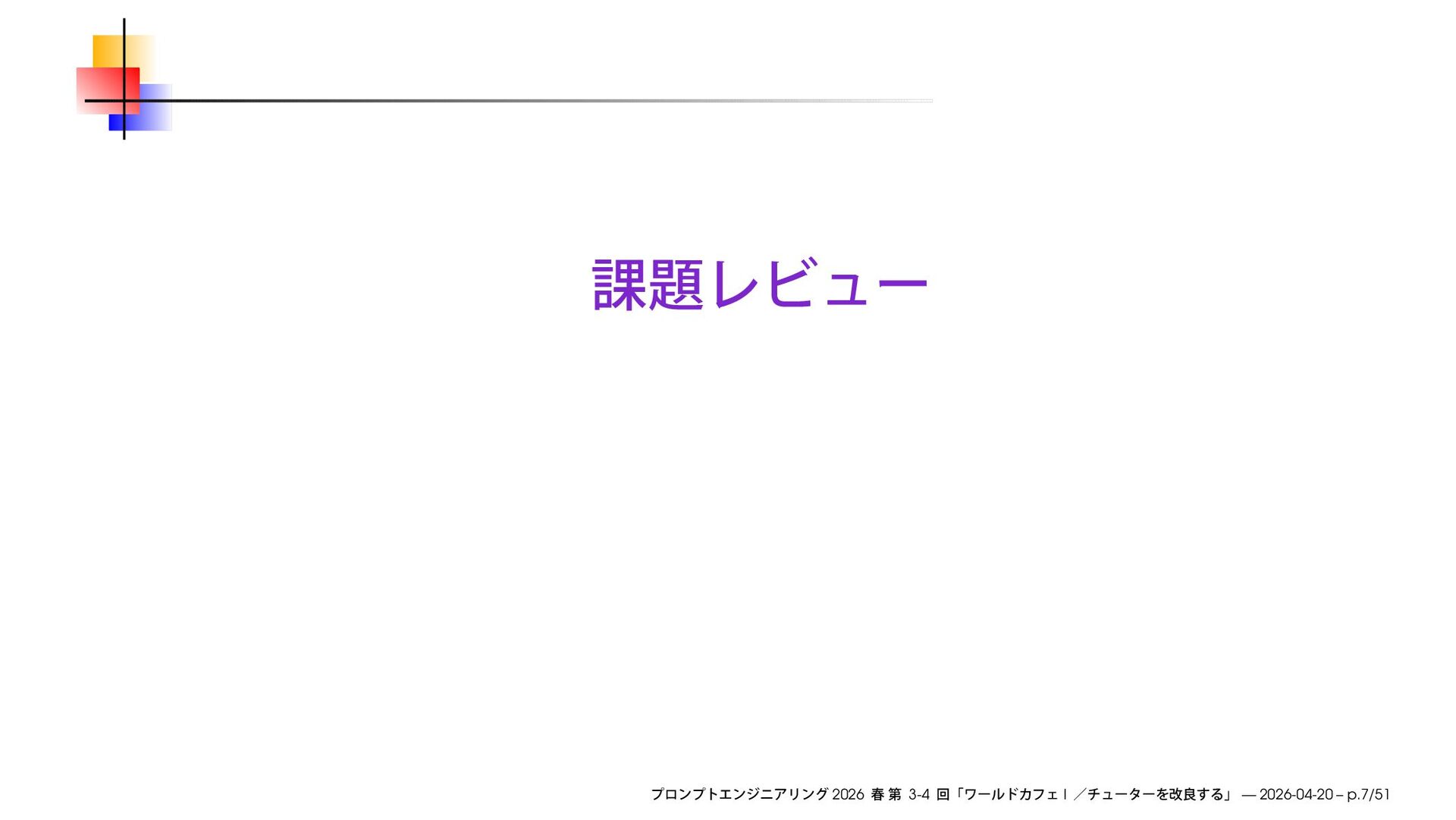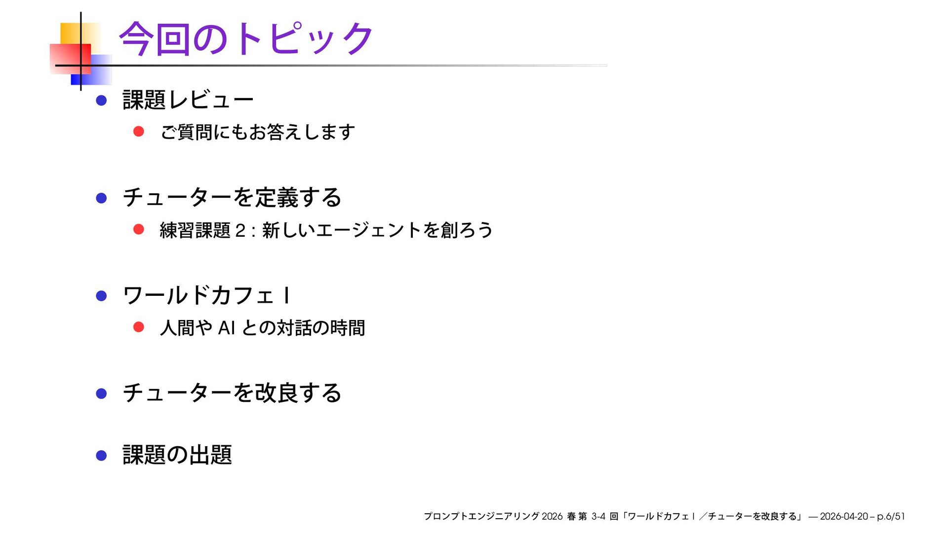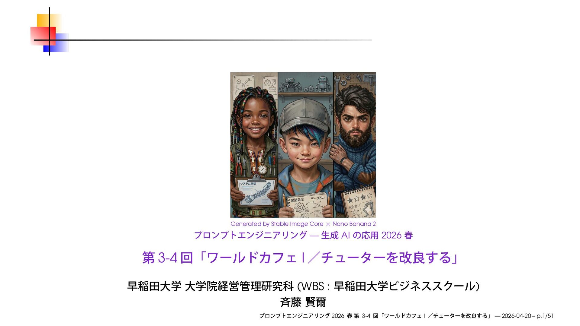 早稲田大学大学院経営管理研究科「プロンプトエンジニアリング ─ 生成AIの応用」2026 春の第1-2回で使用したスライドです。