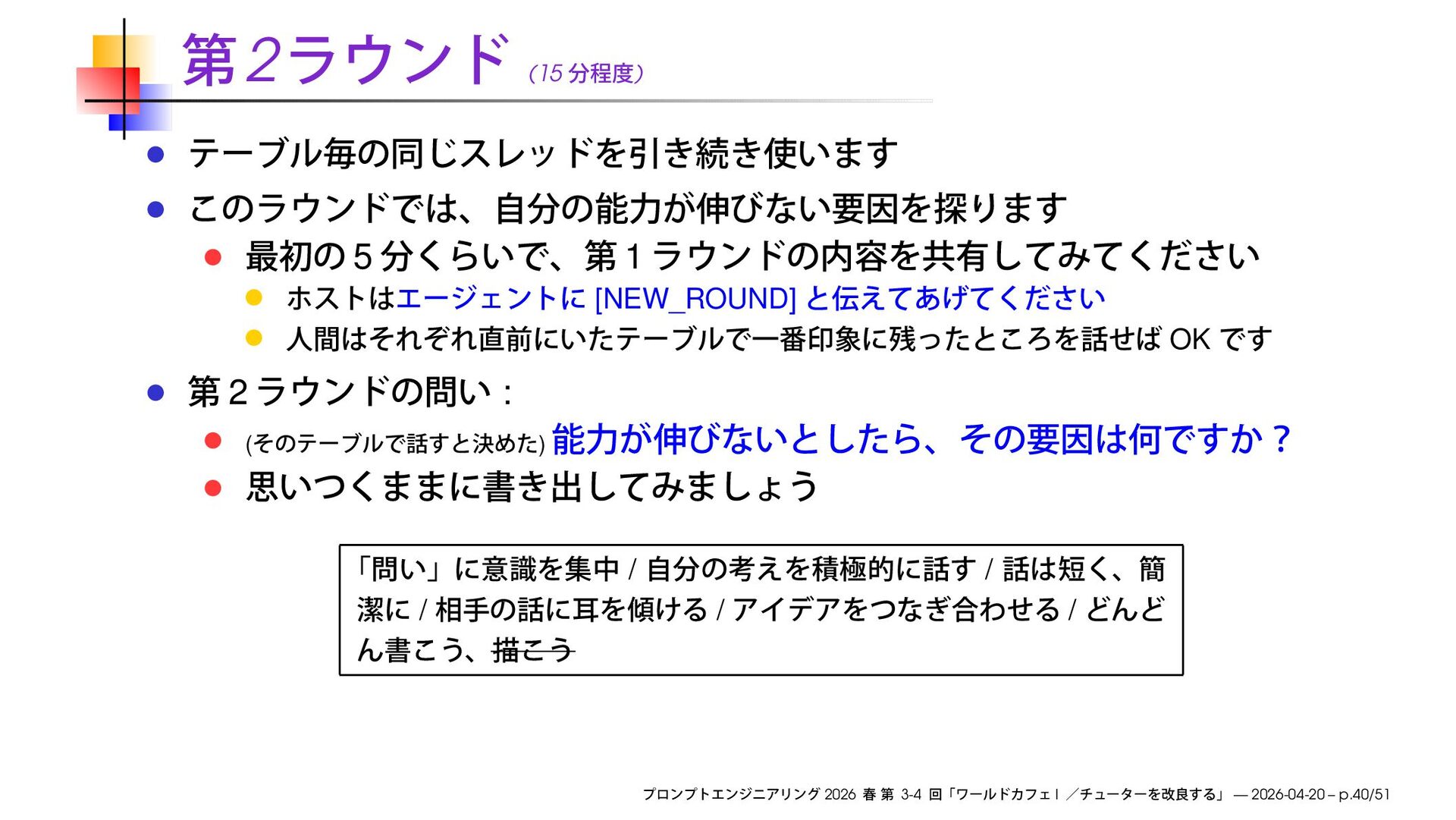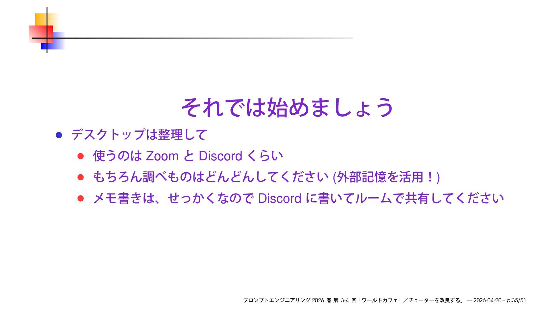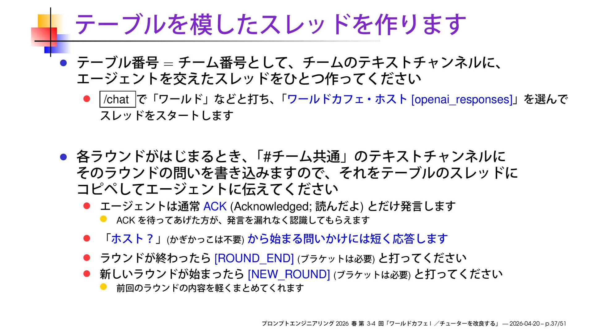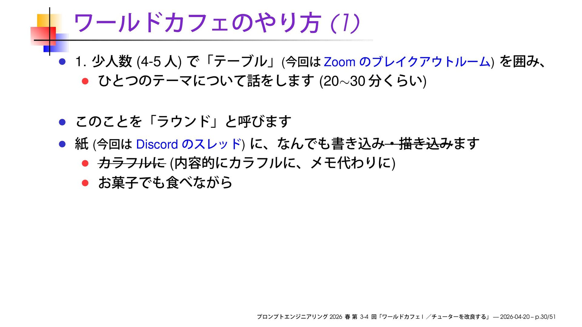 https://speakerdeck.com/ks91/collections/prompt-engineering-2026-spring Discord loglm ( ) 2026 3-4 I — 2026-04-20