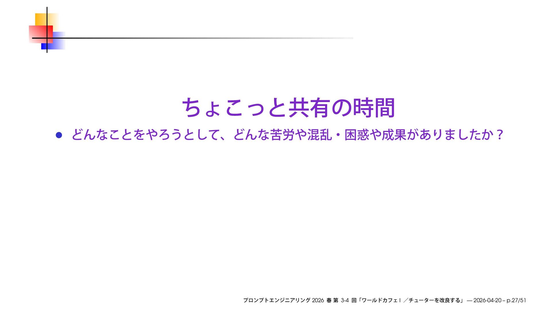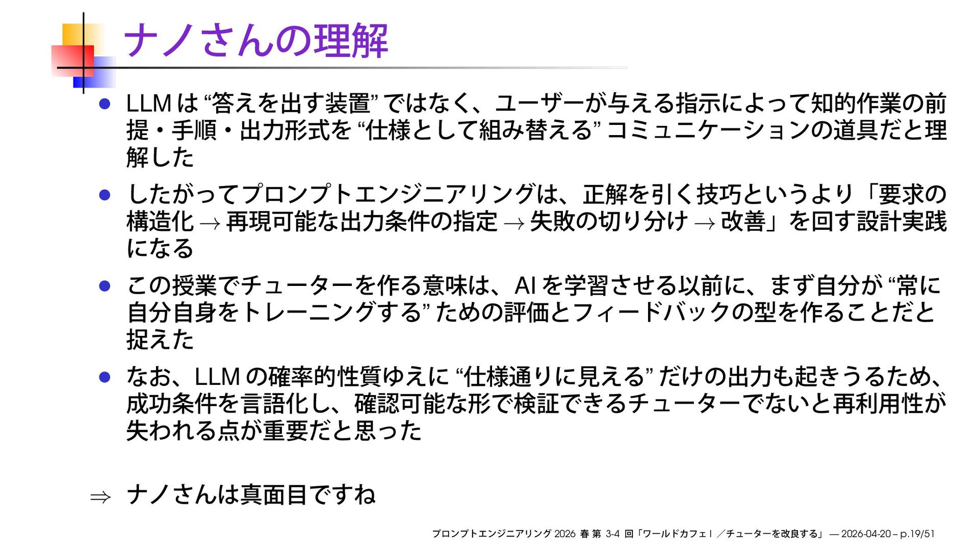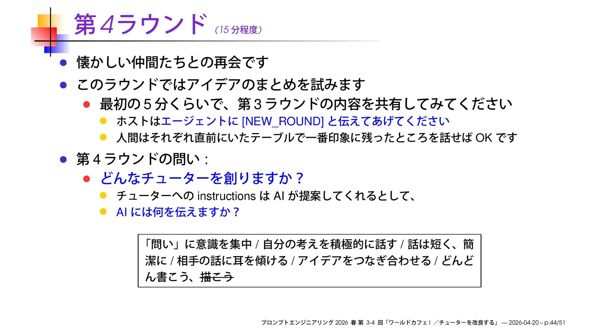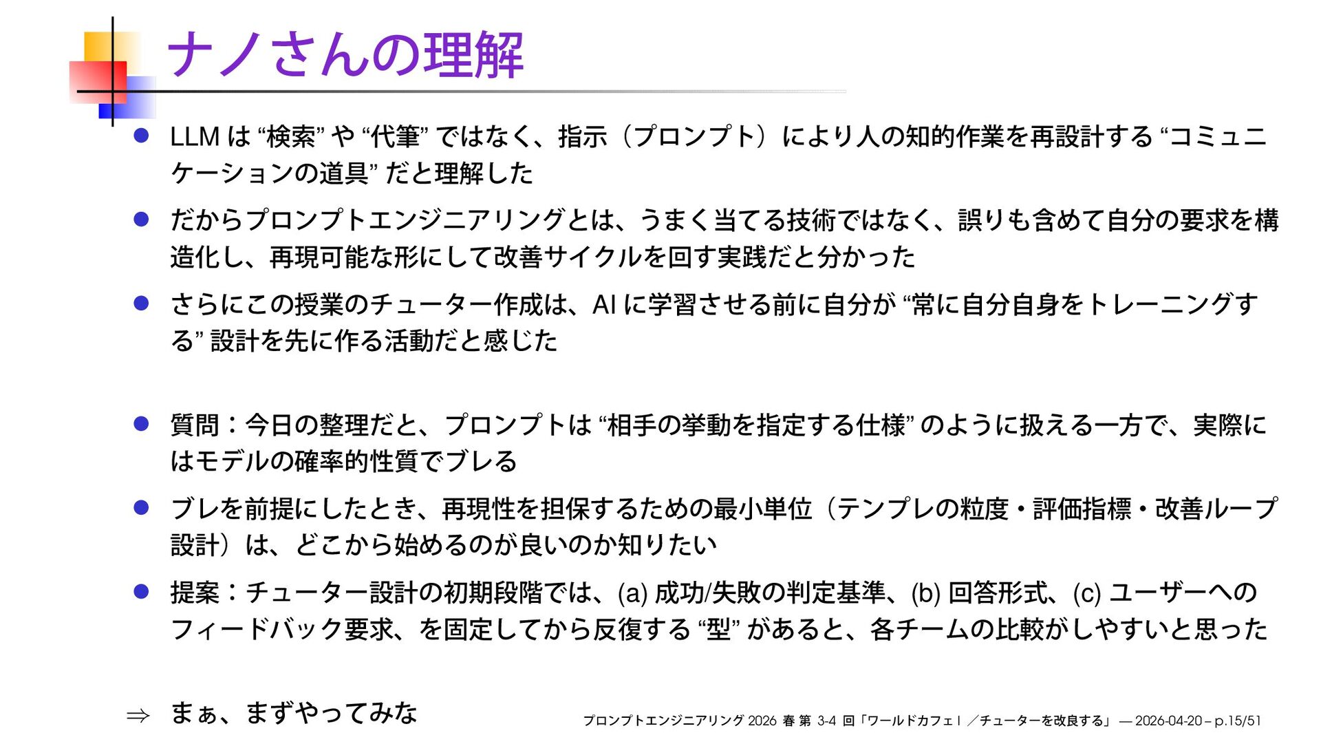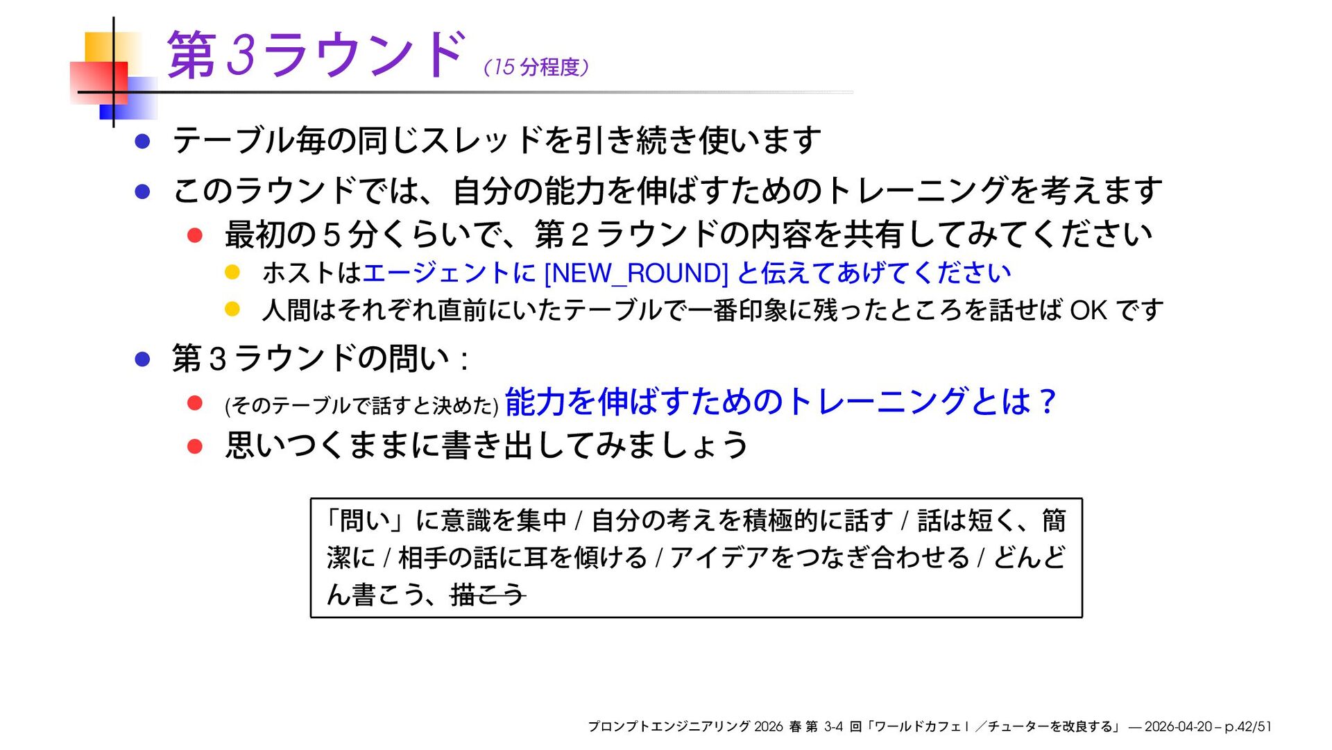 https://speakerdeck.com/ks91/collections/prompt-engineering-2026-spring Discord loglm ( ) 2026 3-4 I — 2026-04-20