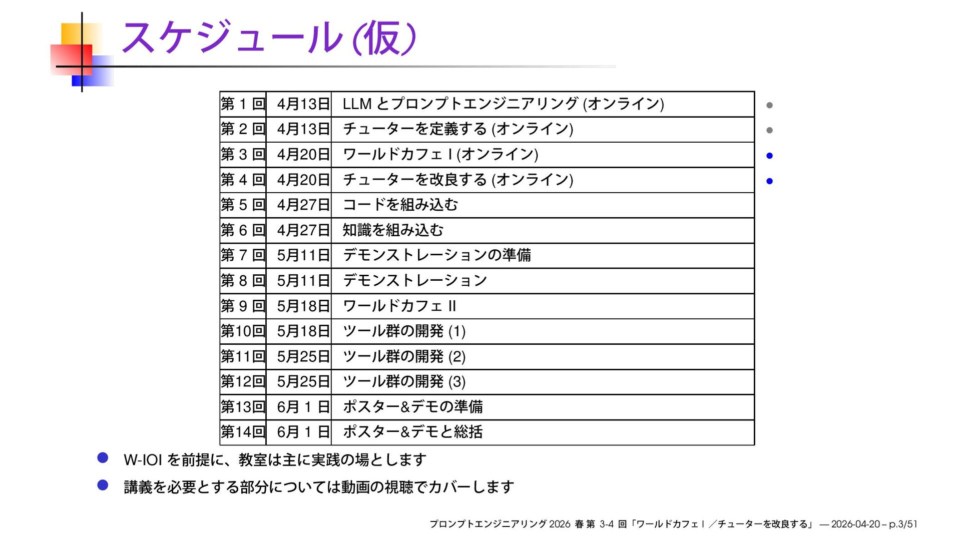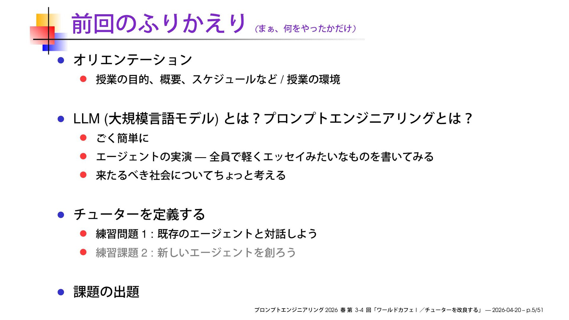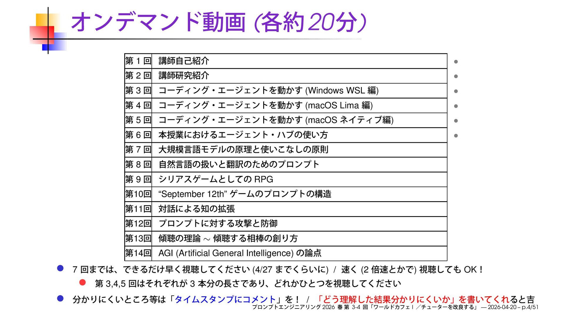 ) • 4 (macOS Lima ) • 5 (macOS ) • 6 • 7 8 9 RPG 10 “September 12th” 11 12 13 ∼ 14 AGI (Artificial General Intelligence) 7 (4/27 ) / (2 ) OK 3,4,5 3 / 2026 3-4 I — 2026-04-20 – p.4/51