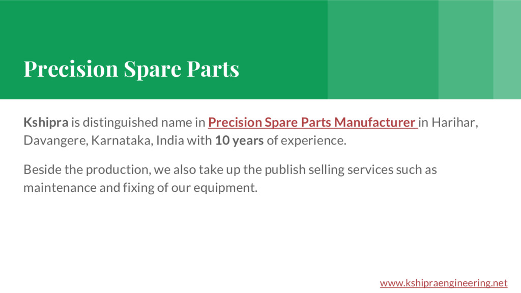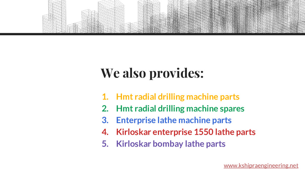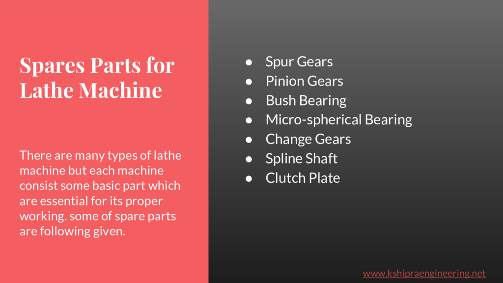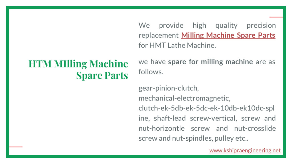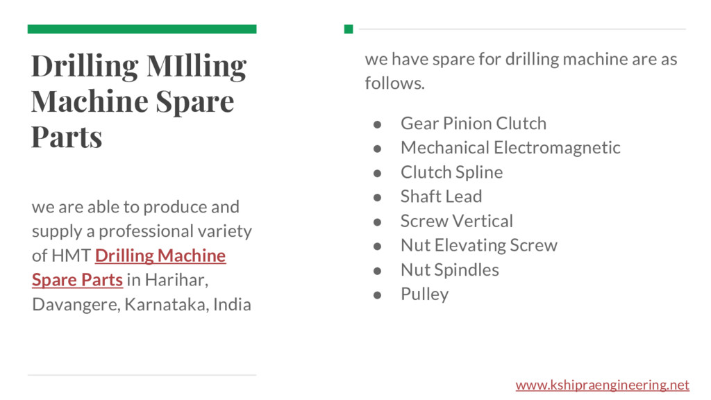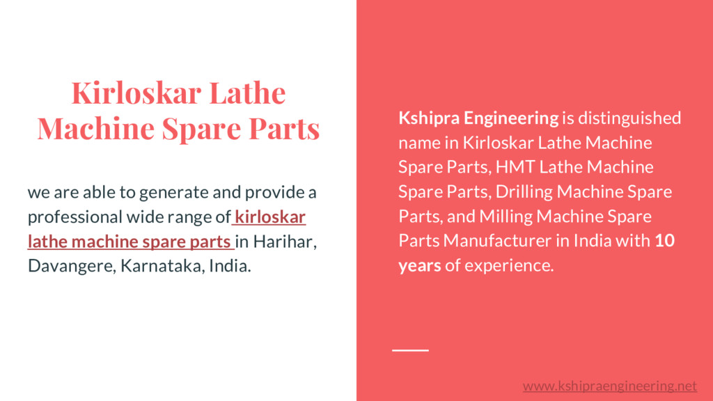 Kshipra Engineering is distinguished name in Kirloskar Lathe Machine Spare Parts, HMT Lathe Machine Spare Parts, Drilling Machine Spare Parts, and Milling Machine Spare Parts Manufacturer in India with 10 years of experience. Know more about Replacement Spares for HMT, Kirlosker Lathe Machine Spare Parts in Harihar, Davangere, and Karnataka, India. Call us on 8192241565 or Email us on [email protected] or visit our site www.kshipraengineering.net/