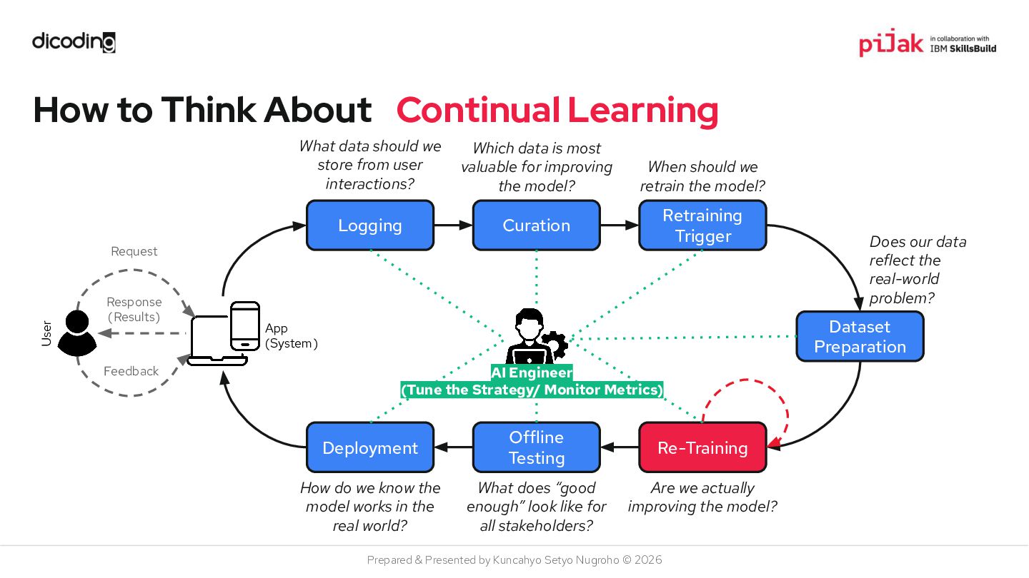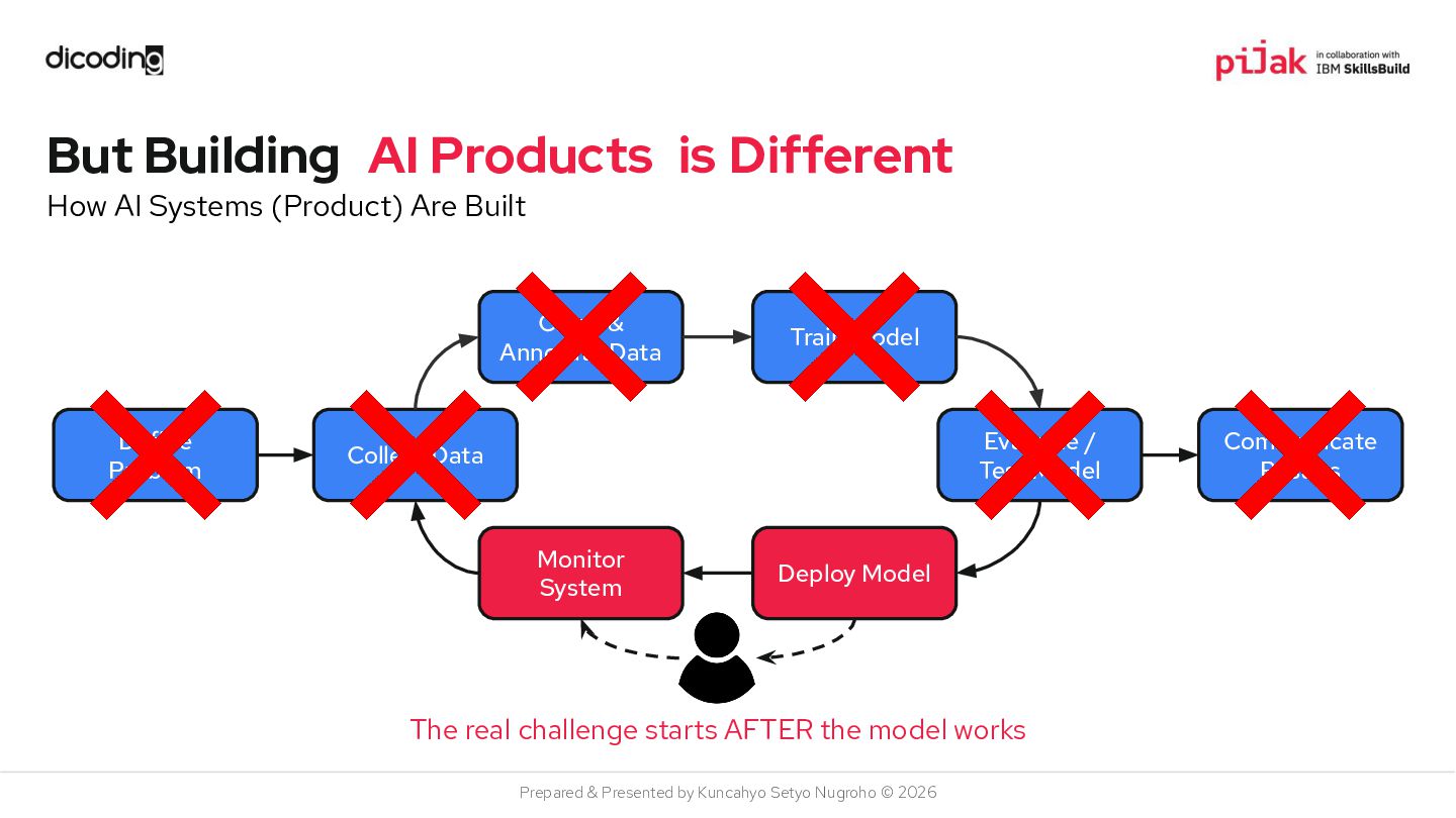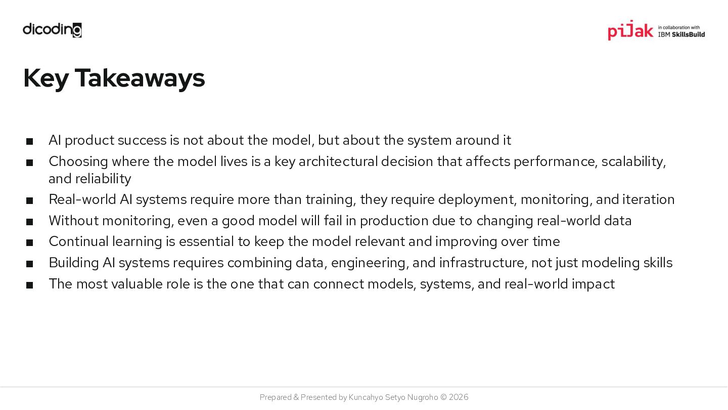2026 ▪ AI product success is not about the model, but about the system around it ▪ Choosing where the model lives is a key architectural decision that affects performance, scalability, and reliability ▪ Real-world AI systems require more than training, they require deployment, monitoring, and iteration ▪ Without monitoring, even a good model will fail in production due to changing real-world data ▪ Continual learning is essential to keep the model relevant and improving over time ▪ Building AI systems requires combining data, engineering, and infrastructure, not just modeling skills ▪ The most valuable role is the one that can connect models, systems, and real-world impact