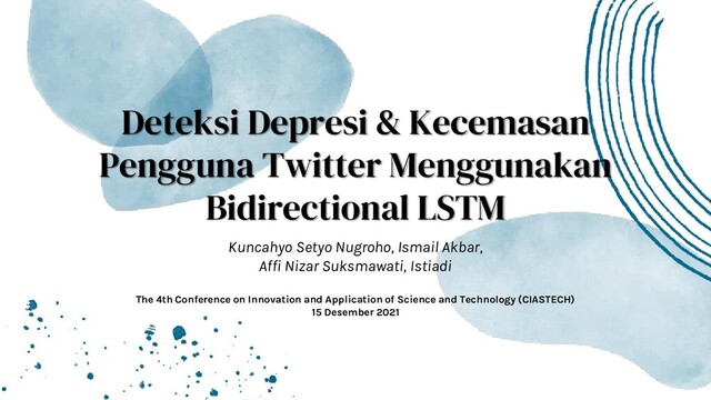 dari semua baseline model dan LSTM standar. • Kemampuan BiLSTM untuk membaca kalimat dari dua arah mampu menangkap informasi konteks yang lebih kaya untuk deteksi depresi dan kecemasan pengguna Twitter. • Selanjutnya, diperlukan kombinasi word embedding dan melakukan hyperparameter- tuning untuk mencapai performa yang lebih baik. Deteksi Depresi & Kecemasan Pengguna Twitter Menggunakan Bidirectional LSTM | CIASTECH 2021