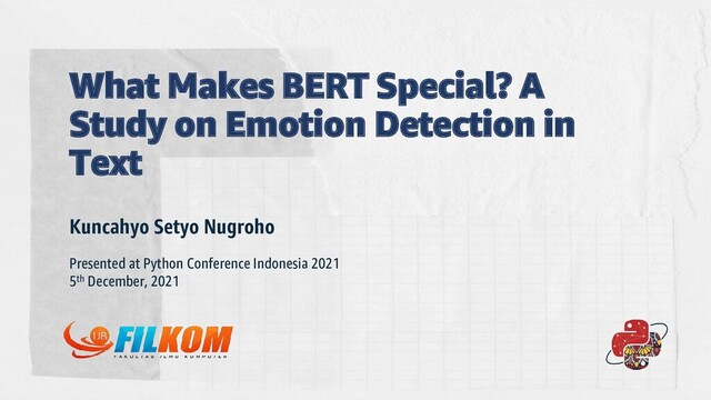in Text | Kuncahyo Setyo Nugroho 4 • Current state-of-the-art in Natural Language Processing (NLP) • What makes BERT "special" and evolved? • How does BERT see the context? • BERT fine-tuning for text-based emotion detection in Indonesian • Future work
