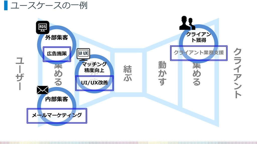 め る 集 め る 動 か す 動 か す 結 ぶ 外部集客 広告施策 内部集客 メールマーケティング マッチング 精度向上 UI/UX改善 クライアン ト獲得 クライアント業務⽀援 UI UX
