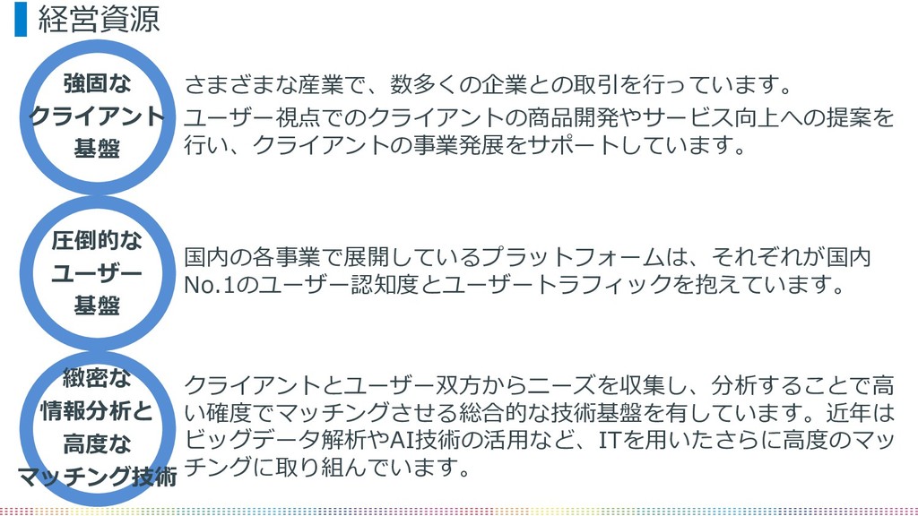 経営資源 さまざまな産業で、数多くの企業との取引を⾏っています。 ユーザー視点でのクライアントの商品開発やサービス向上への提案を ⾏い、クライアントの事業発展をサポートしています。 国内の各事業で展開しているプラットフォームは、それぞれが国内 No.1のユーザー認知度とユーザートラフィックを抱えています。 クライアントとユーザー双⽅からニーズを収集し、分析することで⾼ い確度でマッチングさせる総合的な技術基盤を有しています。近年は ビッグデータ解析やAI技術の活⽤など、ITを⽤いたさらに⾼度のマッ チングに取り組んでいます。