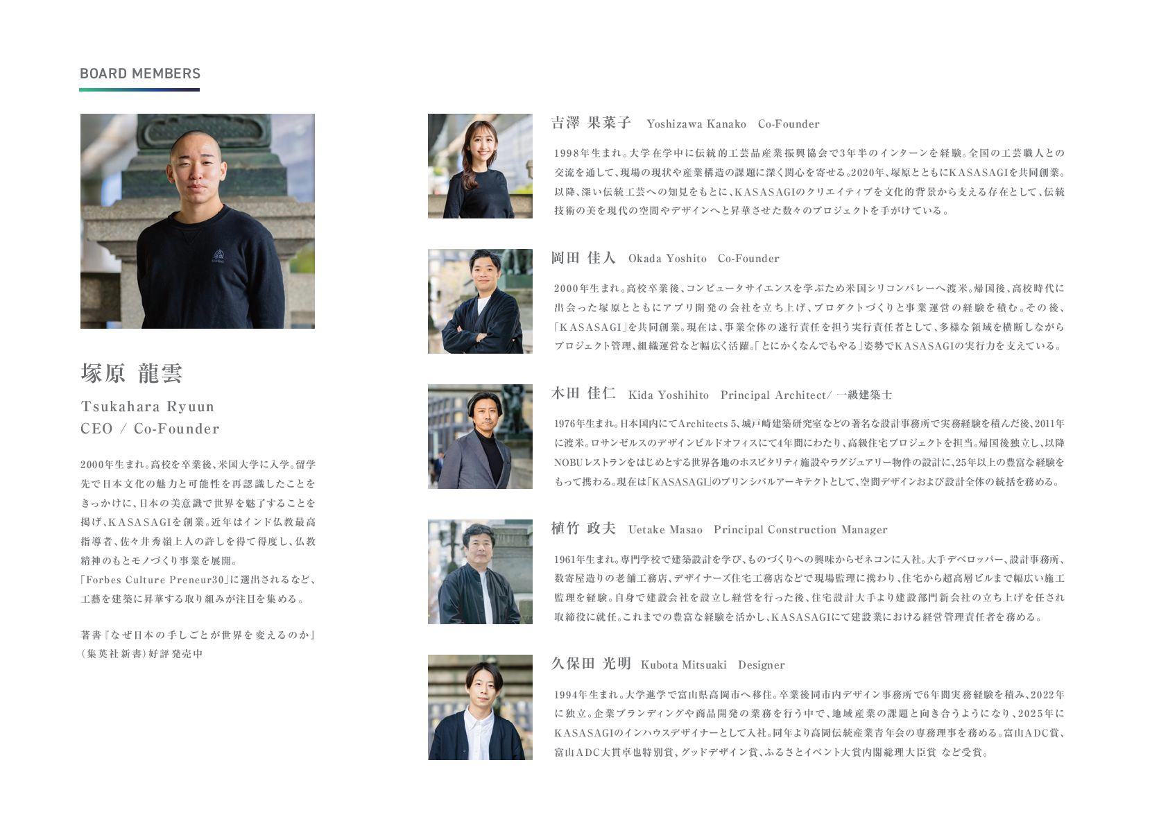 େֶ ࡏֶதʹ ౷తܳ࢈ۀ ৼڵڠձͰ ͷΠϯλʔϯΛܦݧɻ શࠃͷܳ৬ਓͱͷ ަྲྀΛ௨ͯ͠ɺ ݱͷݱঢ়࢈ۀߏͷ՝ʹਂؔ͘৺ΛدͤΔɻ ɺ ௩ݪͱͱʹ,"4"4"(*Λڞಉۀɻ Ҏ߱ɺ ਂ͍౷ܳͷݟΛͱʹɺ ,"4"4"(*ͷΫϦΤΠςΟϒΛจԽతഎܠ͔Βࢧ͑Δଘࡏͱͯ͠ɺ ౷ ٕज़ͷඒΛݱͷۭؒσβΠϯͱঢ՚ͤͨ͞ʑͷϓϩδΣΫτΛख͕͚͍ͯΔɻ ԬాՂਓ ੜ·Εɻ ߴߍଔۀޙɺ ίϯϐϡʔλαΠΤϯεΛֶͿͨΊถࠃγϦίϯόϨʔถɻ ؼࠃޙɺ ߴߍ࣌ʹ ग़ ձͬͨ௩ ݪͱͱʹΞϓϦ։ ൃ ͷ ձ ࣾΛ্ཱͪ͛ ɺ ϓϩμΫτͮ͘Γͱࣄ ۀ ӡ Ӧͷ ܦ ݧ ΛੵΉ ɻ ͦͷ ޙ ɺ ʮ,"4"4"(*ʯ Λڞಉۀɻ ݱࡏɺ ࣄۀશମͷߦΛ୲͏࣮ߦऀͱͯ͠ɺ ଟ༷ͳྖҬΛԣஅ͠ͳ͕Β ϓϩδΣΫτཧɺ ৫ӡӦͳͲ෯͘׆༂ɻ ʮͱʹ͔͘ͳΜͰΔʯ ࢟Ͱ,"4"4"(*ͷ࣮ߦྗΛࢧ͍͑ͯΔɻ ాՂਔ ੜ·Εɻ ຊࠃʹͯ"SDIJUFDUTɺ ށ࡚ݐஙݚڀࣨͳͲͷஶ໊ͳઃܭࣄॴͰ࣮ܦݧΛੵΜͩޙɺ ʹถɻ ϩαϯθϧεͷσβΠϯϏϧυΦϑΟεʹͯؒʹΘͨΓɺ ߴڃॅϓϩδΣΫτΛ୲ɻ ؼࠃޙಠཱ͠ɺ Ҏ߱ /0#6ϨετϥϯΛ͡Ίͱ͢Δੈք֤ͷϗεϐλϦςΟࢪઃϥάδϡΞϦʔ݅ͷઃܭʹɺ Ҏ্ͷ๛ͳܦݧΛ ͬͯܞΘΔɻ ݱࡏ ʮ,"4"4"(*ʯ ͷϓϦϯγύϧΞʔΩςΫ τͱͯ͠ɺ ۭؒσβΠϯ͓Αͼઃܭશମͷ౷ׅΛΊΔɻ ২ ੜ·Εɻ ઐֶߍͰݐஙઃܭΛֶͼɺ ͷͮ͘Γͷڵຯ͔Βθωίϯʹೖࣾɻ େखσϕϩούʔɺ ઃܭࣄॴɺ دΓͷฮళɺ σβΠφʔζॅళͳͲͰݱཧʹܞΘΓɺ ॅ͔ΒߴϏϧ·Ͱ෯͍ࢪ ཧΛܦݧɻ ࣗͰݐઃձࣾΛઃཱ͠ܦӦΛߦͬͨޙɺ ॅઃܭେखΑΓݐઃ෦৽ձࣾͷ্ཱͪ͛Λ͞Ε औకʹबɻ ͜Ε·Ͱͷ๛ͳܦݧΛ׆͔͠ɺ ,"4"4"(*ʹͯݐઃۀʹ͓͚ΔܦӦཧऀΛΊΔɻ ٱอాޫ໌ ੜ·Εɻ େֶਐֶͰࢁݝߴԬࢢҠॅɻ ଔۀޙಉࢢσβΠϯࣄॴͰ࣮ؒܦݧΛੵΈɺ ʹಠཱɻ اۀϒϥϯσΟϯά։ൃͷۀ Λߦ͏தͰɺ Ҭ࢈ۀͷ՝ͱ͖߹͏Α͏ʹͳΓɺ ʹ ,"4"4"(*ͷΠϯϋεσβΠφʔͱͯ͠ೖࣾɻ ಉΑΓߴԬ౷࢈ۀ੨ձͷઐཧࣄΛΊΔɻ ࢁ"%$ɺ ࢁ"%$େ؏ಛผɺ άουσβΠϯɺ ;Δ͞ͱΠϕϯτେֳ૯ཧେਉͳͲडɻ ௩ݪཾӢ $&0$P'PVOEFS 5TVLBIBSB3ZVVO ੜ·Εɻ ߴߍΛଔۀޙɺ ถࠃେֶʹೖֶɻ ཹֶ ઌͰຊจԽͷັྗͱՄೳ ੑΛ࠶ೝࣝͨ͜͠ͱΛ ͖͔͚ͬʹɺ ຊͷඒҙࣝͰੈքΛັྃ͢Δ͜ͱΛ ܝ͛ɺ , "4"4"(*Λۀɻ ۙΠϯυڭ࠷ߴ ࢦಋऀɺ ࠤʑҪलྮ্ਓͷڐ͠Λಘͯಘ͠ɺ ڭ ਫ਼ਆͷͱϞϊͮ͘ΓࣄۀΛల։ɻ ʮ'PSCFT$VMUVSF1SFOFVSʯ ʹબग़͞ΕΔͳͲɺ Λݐஙʹঢ՚͢ΔऔΓΈ͕ΛूΊΔɻ ஶॻ ʰ ͳ ͥຊ ͷ ख͠͝ͱ͕ੈք Λม͑Δͷ͔ ʱ ʢूӳ ࣾ ৽ॻʣ ධ ൃചத BOARD MEMBERS
