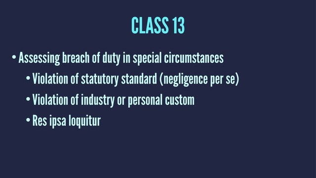 that prohibits particular conduct (and therefore establishes a specific duty of care) 2. The prohibition is designed to protect against the harm for which recovery in tort is sought 3. The harmed person is in the class of persons intended to be protected by the statute or regulation 4. Note: violation must be the cause of the harm