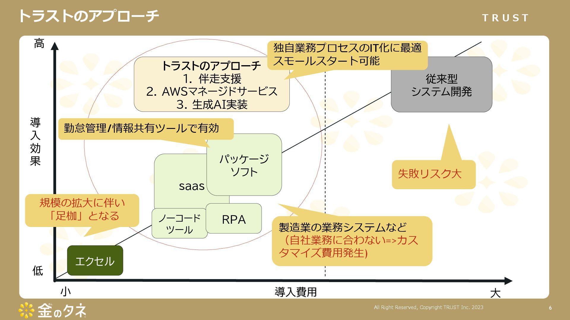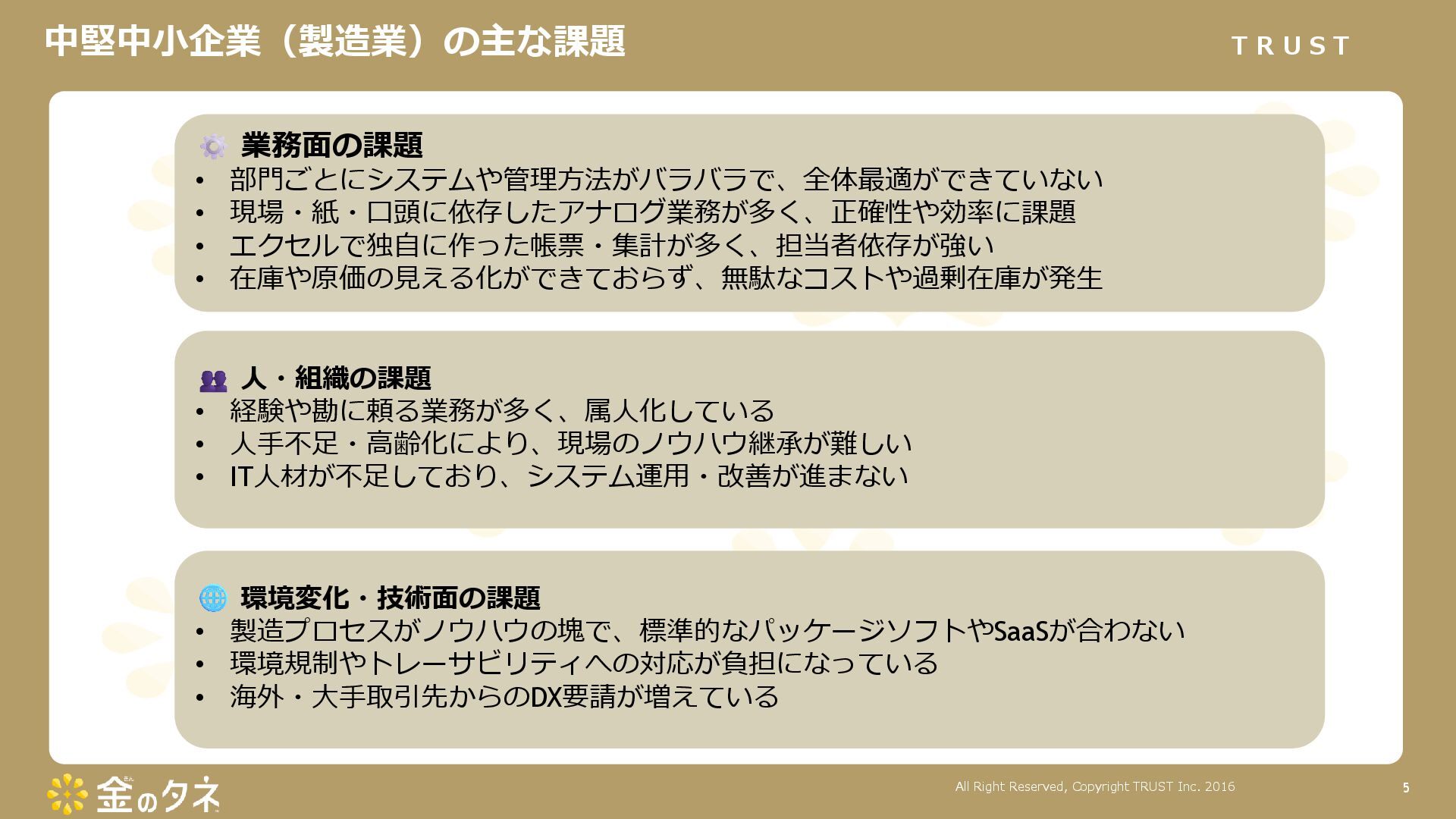 Inc. 2016 5 中堅中小企業(製造業)の主な課題 業務面の課題 • 部門ごとにシステムや管理方法がバラバラで、全体最適ができていない • 現場・紙・口頭に依存したアナログ業務が多く、正確性や効率に課題 • エクセルで独自に作った帳票・集計が多く、担当者依存が強い • 在庫や原価の見える化ができておらず、無駄なコストや過剰在庫が発生 人・組織の課題 • 経験や勘に頼る業務が多く、属人化している • 人手不足・高齢化により、現場のノウハウ継承が難しい • IT人材が不足しており、システム運用・改善が進まない 環境変化・技術面の課題 • 製造プロセスがノウハウの塊で、標準的なパッケージソフトやSaaSが合わない • 環境規制やトレーサビリティへの対応が負担になっている • 海外・大手取引先からのDX要請が増えている