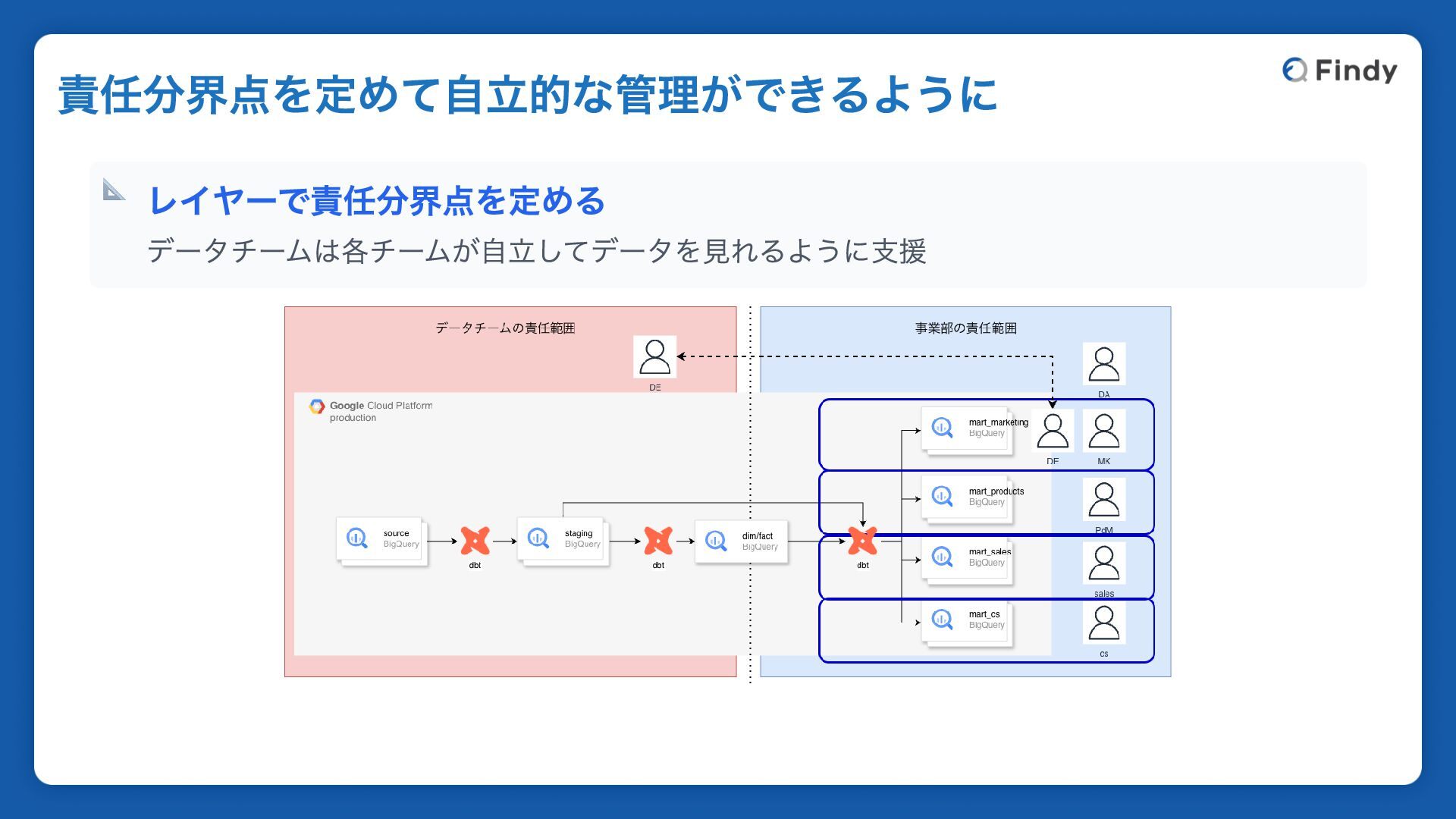 📐 レイヤーで責任分界点を定める データチームは各チームが自立してデータを見れるように支援 責任分界点を定めて自立的な管理ができるように