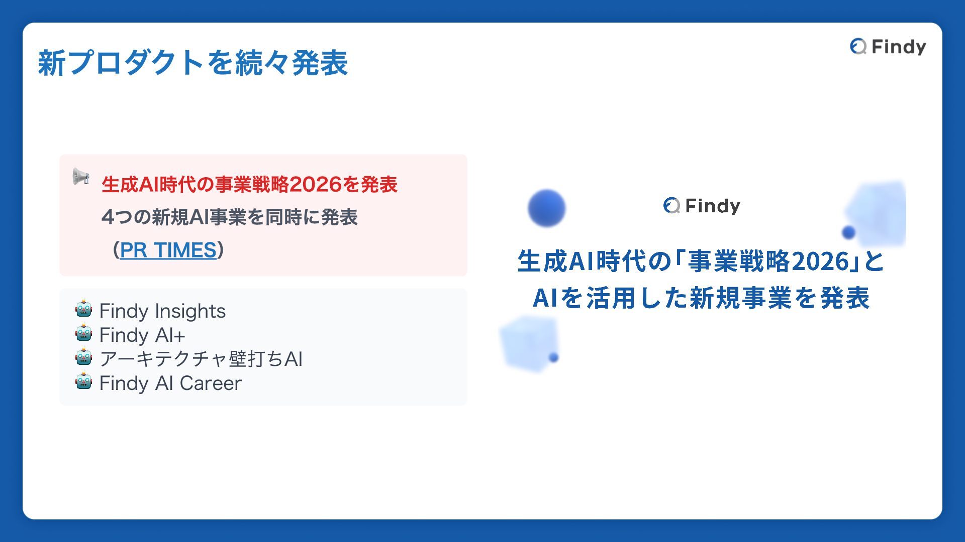 📢 生成AI時代の事業戦略2026を発表 4つの新規AI事業を同時に発表 (PR TIMES) 🤖 Findy Insights 🤖 Findy