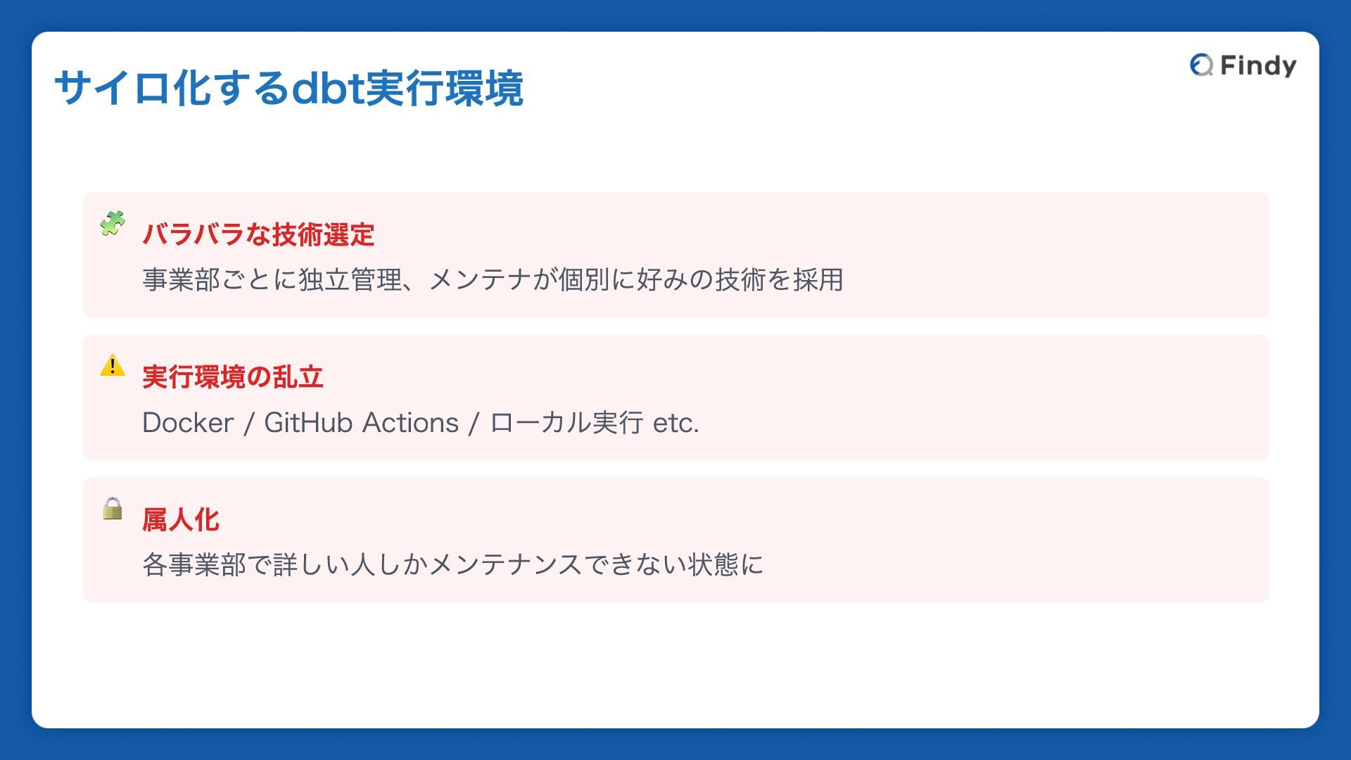 ローカル実行 etc. 🔒 属人化 各事業部で詳しい人しかメンテナンスできない状態に サイロ化するdbt実行環境