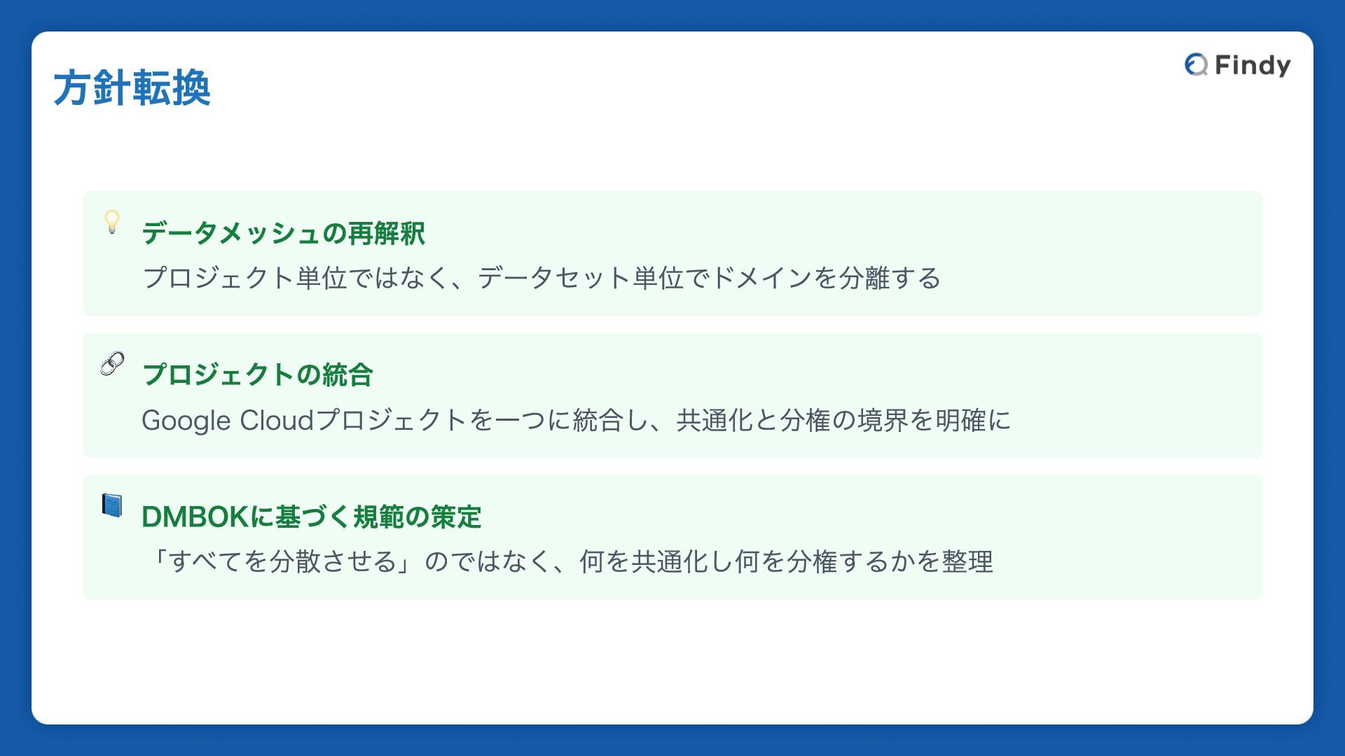 💡 データメッシュの再解釈 プロジェクト単位ではなく、データセット単位でドメインを分離する 🔗 プロジェクトの統合 Google Cloudプロジェクトを一つに統合し、共通化と分権の境界を明確に 📘 DMBOKに基づく規範の策定 「すべてを分散させる」のではなく、何を共通化し何を分権するかを整理