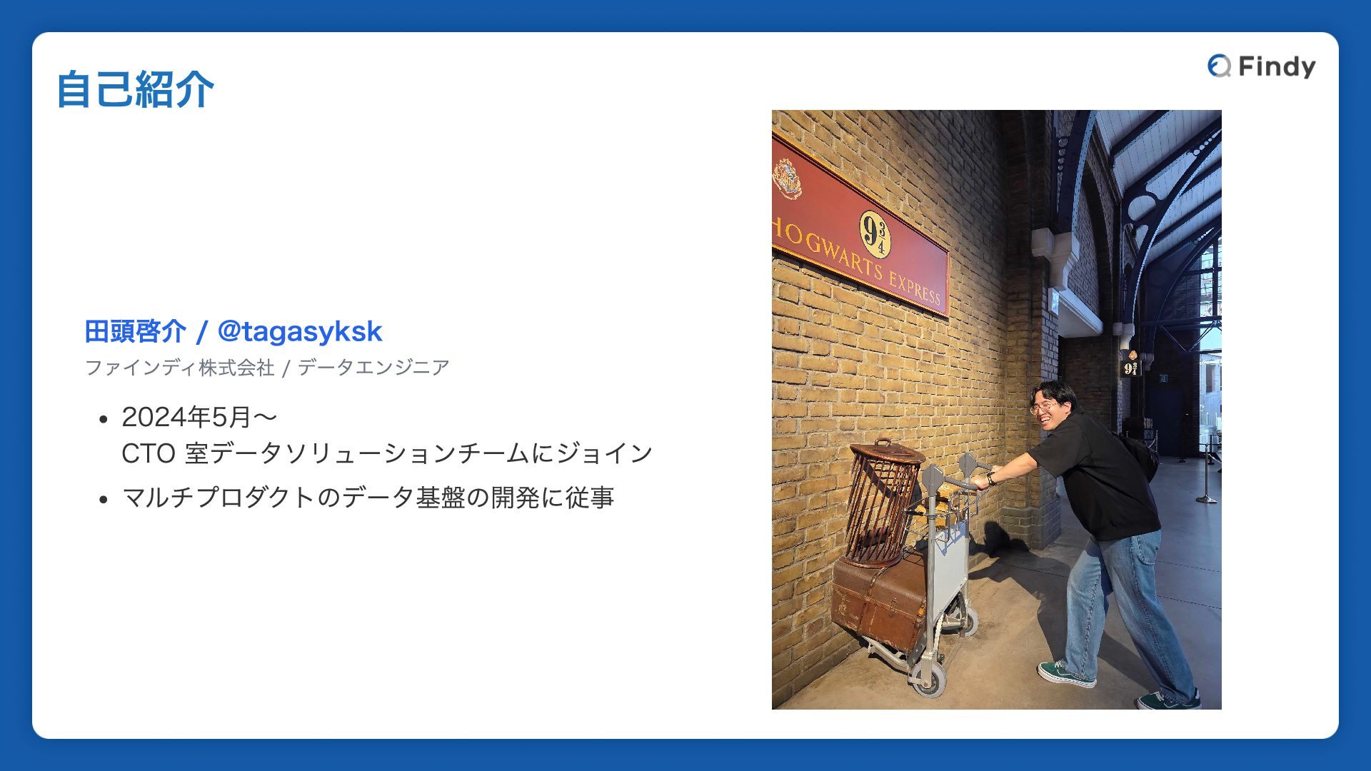 田頭啓介 / @tagasyksk ファインディ株式会社 / データエンジニア 2024年5月〜 CTO 室データソリューションチームにジョイン マルチプロダクトのデータ基盤の開発に従事