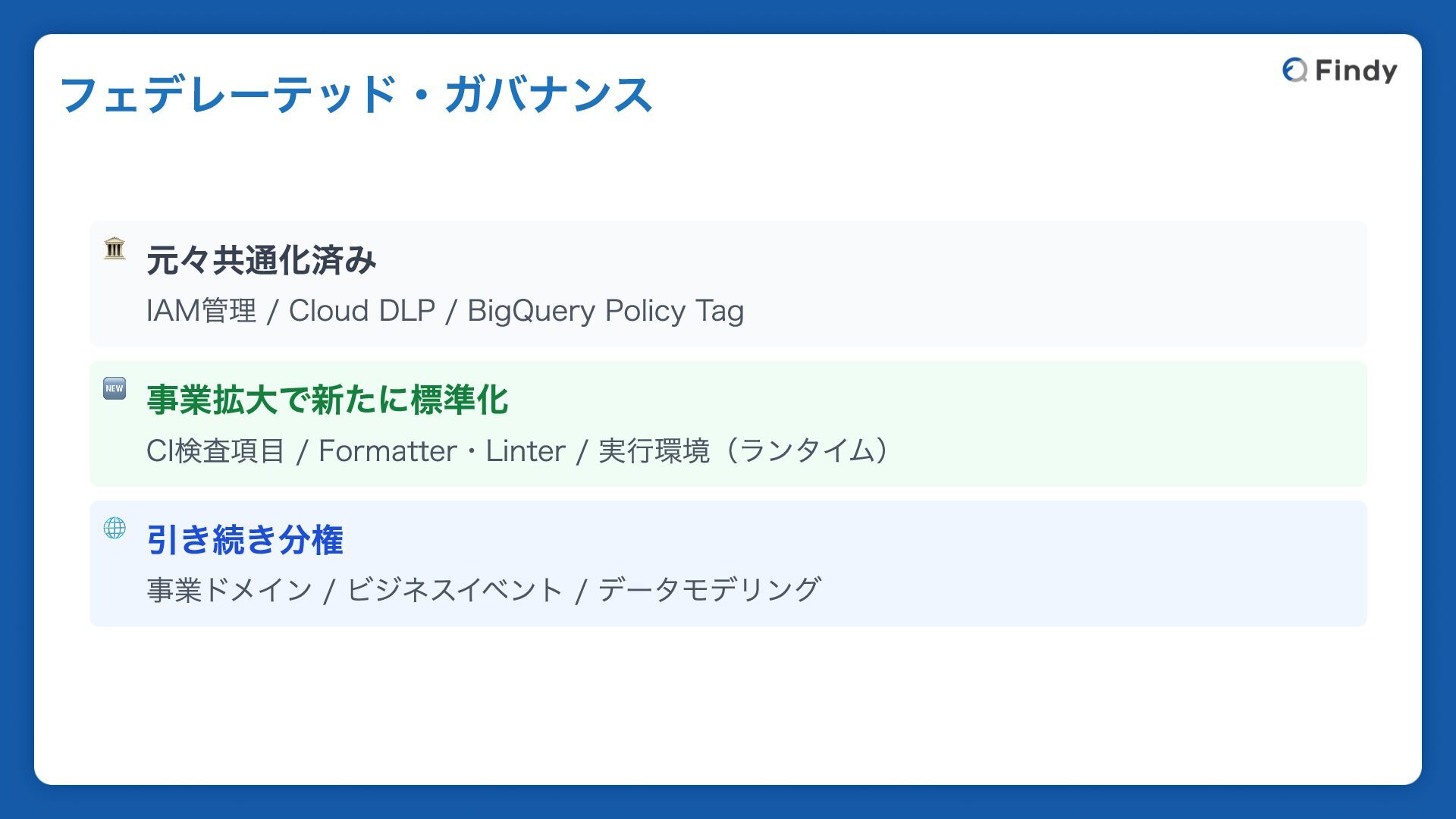 🆕 事業拡大で新たに標準化 CI検査項目 / Formatter・Linter / 実行環境(ランタイム) 🌐 引き続き分権 事業ドメイン / ビジネスイベント / データモデリング フェデレーテッド・ガバナンス