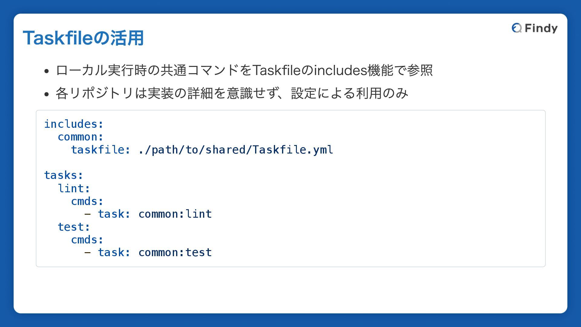ローカル実行時の共通コマンドをTaskfileのincludes機能で参照 各リポジトリは実装の詳細を意識せず、設定による利用のみ includes: common: taskfile: ./path/to/shared/Taskfile.yml tasks: lint: cmds: -