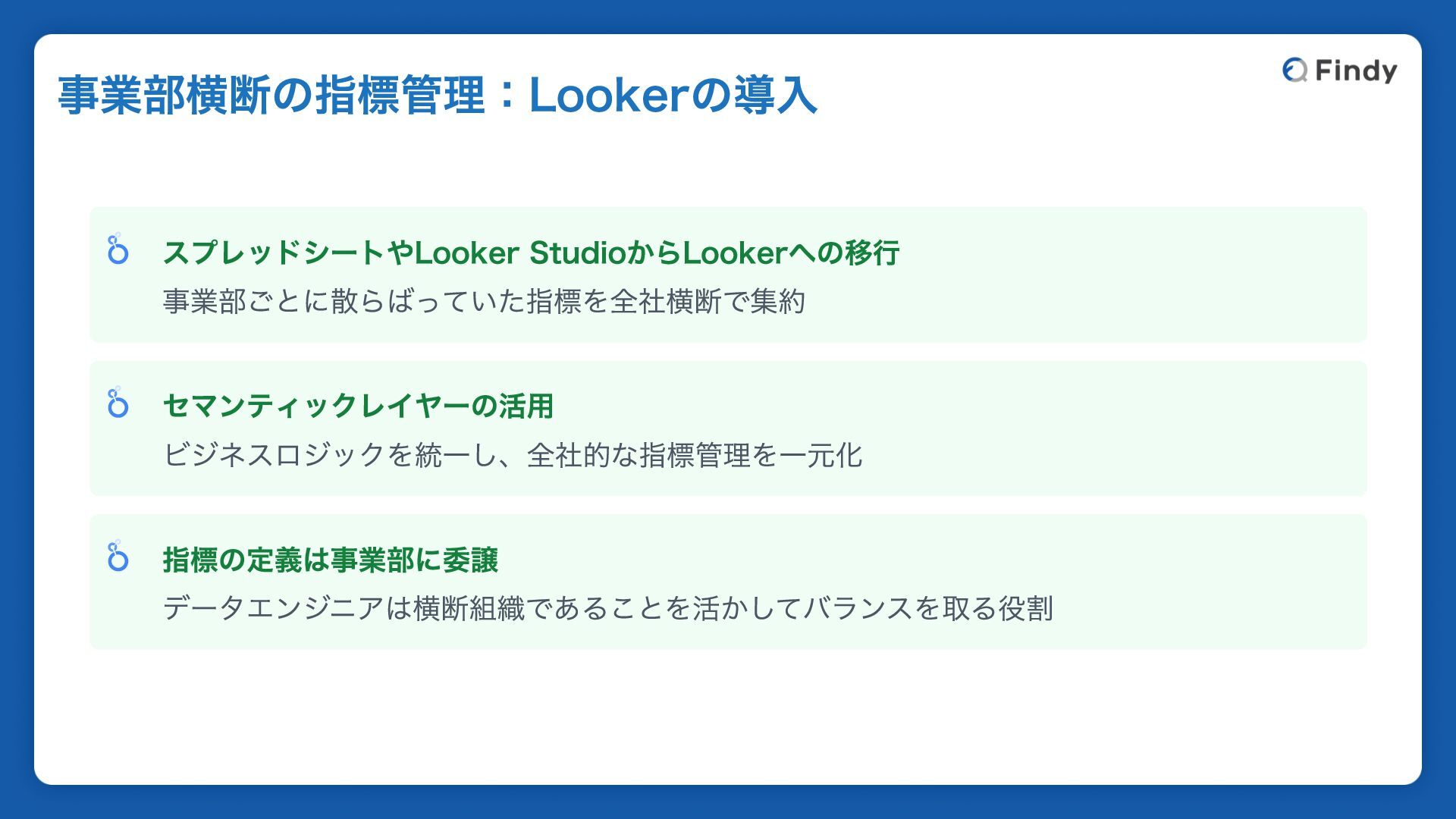 スプレッドシートやLooker StudioからLookerへの移行 事業部ごとに散らばっていた指標を全社横断で集約 セマンティックレイヤーの活用 ビジネスロジックを統一し、全社的な指標管理を一元化 指標の定義は事業部に委譲 データエンジニアは横断組織であることを活かしてバランスを取る役割 事業部横断の指標管理:Lookerの導入